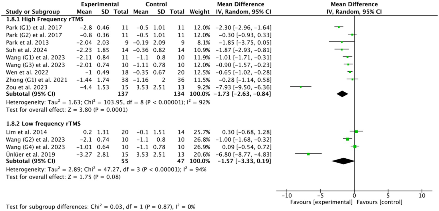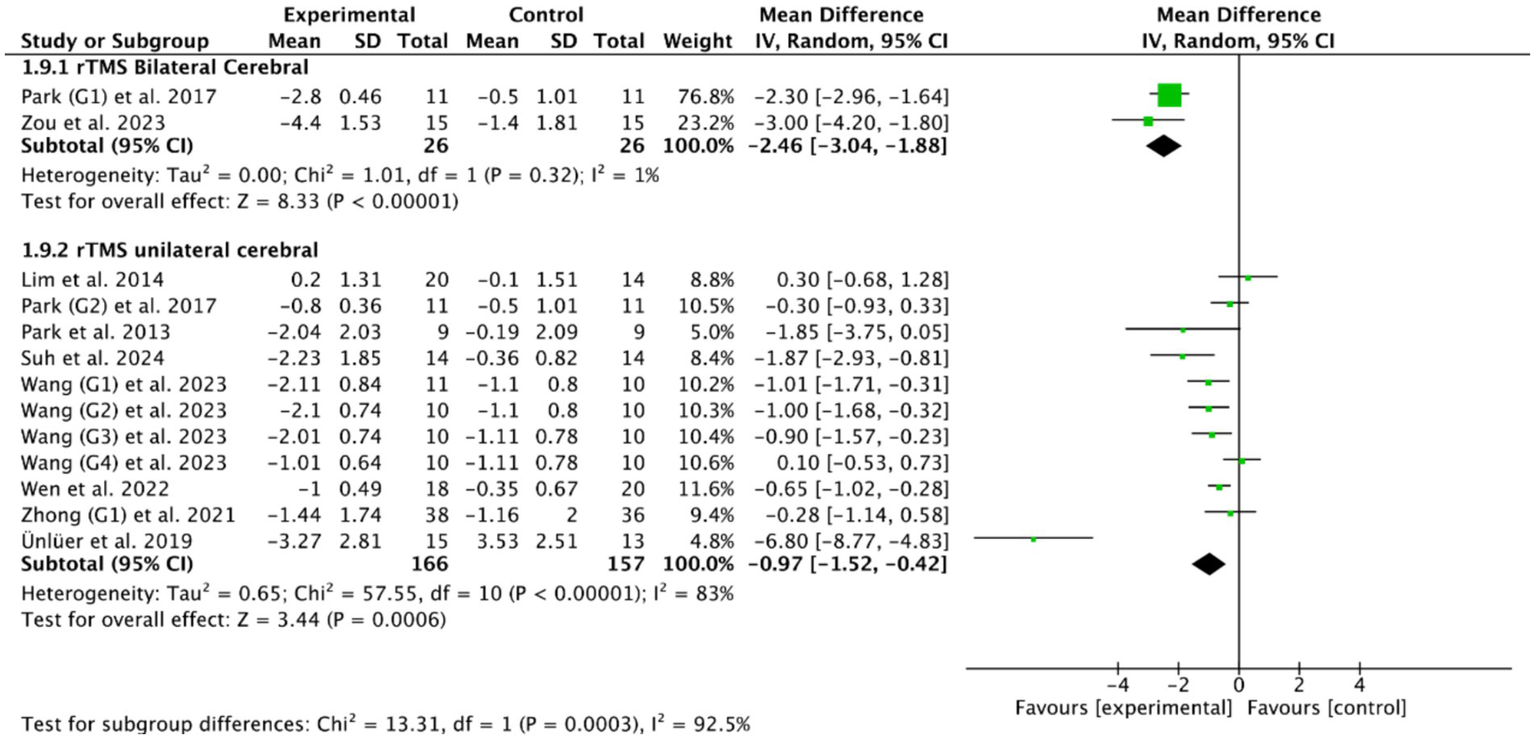 Current research of rTMS for the treatment of PSD vary in stimulation site, frequency, intensity, and modality. For example, some studies showed positive outcomes in the treatment of cerebral rTMS (motor cortex associated with the mylohyoid muscle) (33, 34), while others reported comparable efficacy of cerebellar rTMS treatment (35). Bilateral or unilateral cerebral rTMS treatment also shows different effectiveness (28, 36). Frequency selection remains debated, with both LF-rTMS (37, 38) and HF-rMTS (28, 39, 40) demonstrating therapeutic benefits across studies. This parameter heterogeneity highlights the absence of standardized protocols in clinical practice. This meta-analysis systematically evaluated the efficacy and safety of rTMS with different stimulation parameters in the treatment of PSD, aiming to provide evidence-based recommendations for clinical practice.