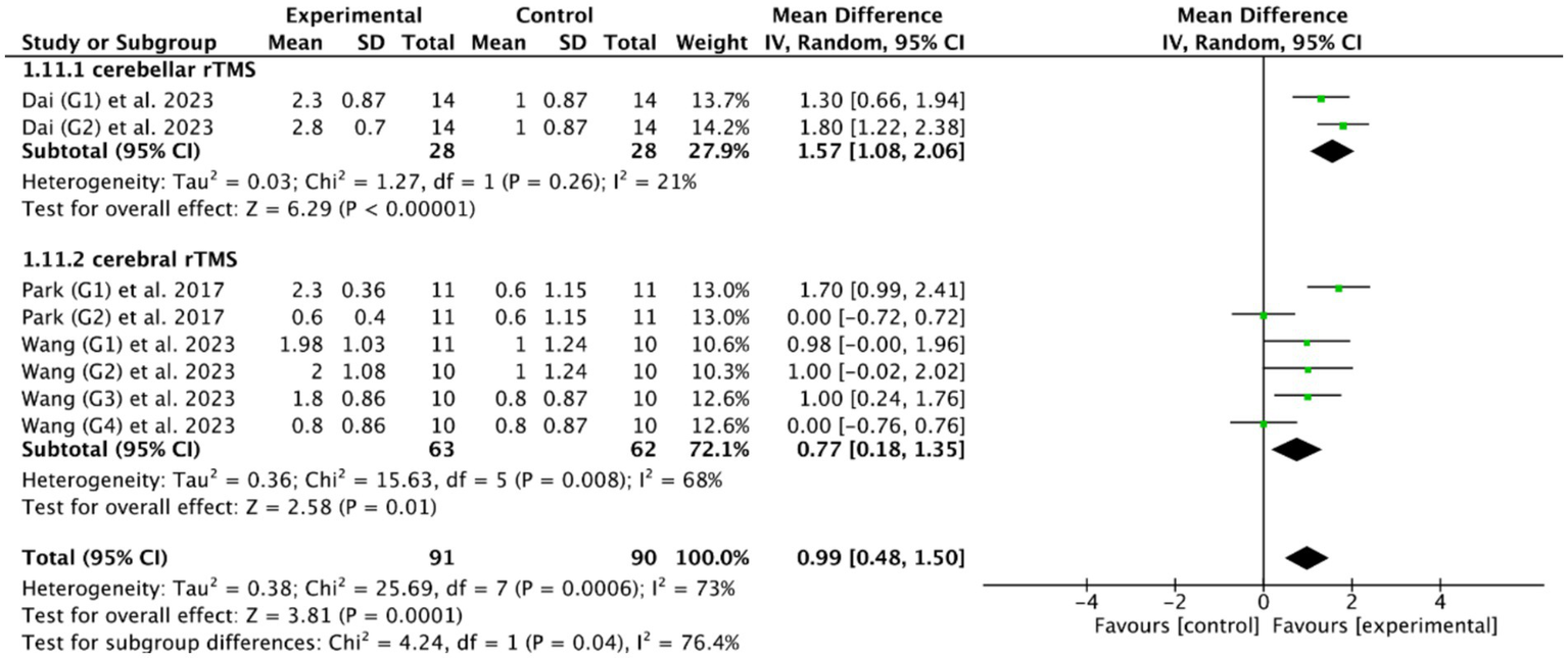 Two reviewers (CG and X-MP) independently extracted the following parameters from included studies: (1) Bibliometric data: first author, publication year and sample size; (2) Demographic characteristics: sex, age distribution, stroke classification (ischemic/hemorrhagic), lesion localization and disease duration; (3) Intervention protocols: stimulation site coordinates, intensity, frequency (Hz), pulse count per session and total intervention duration. During data extraction, discrepancies or incomplete records were resolved through correspondence with original authors. Studies with unresolved data gaps after three unsuccessful contact attempts were classified as containing incomplete datasets. Inter-rater disagreements were adjudicated by consultation with the principal investigator (YuL) to establish methodological consensus.