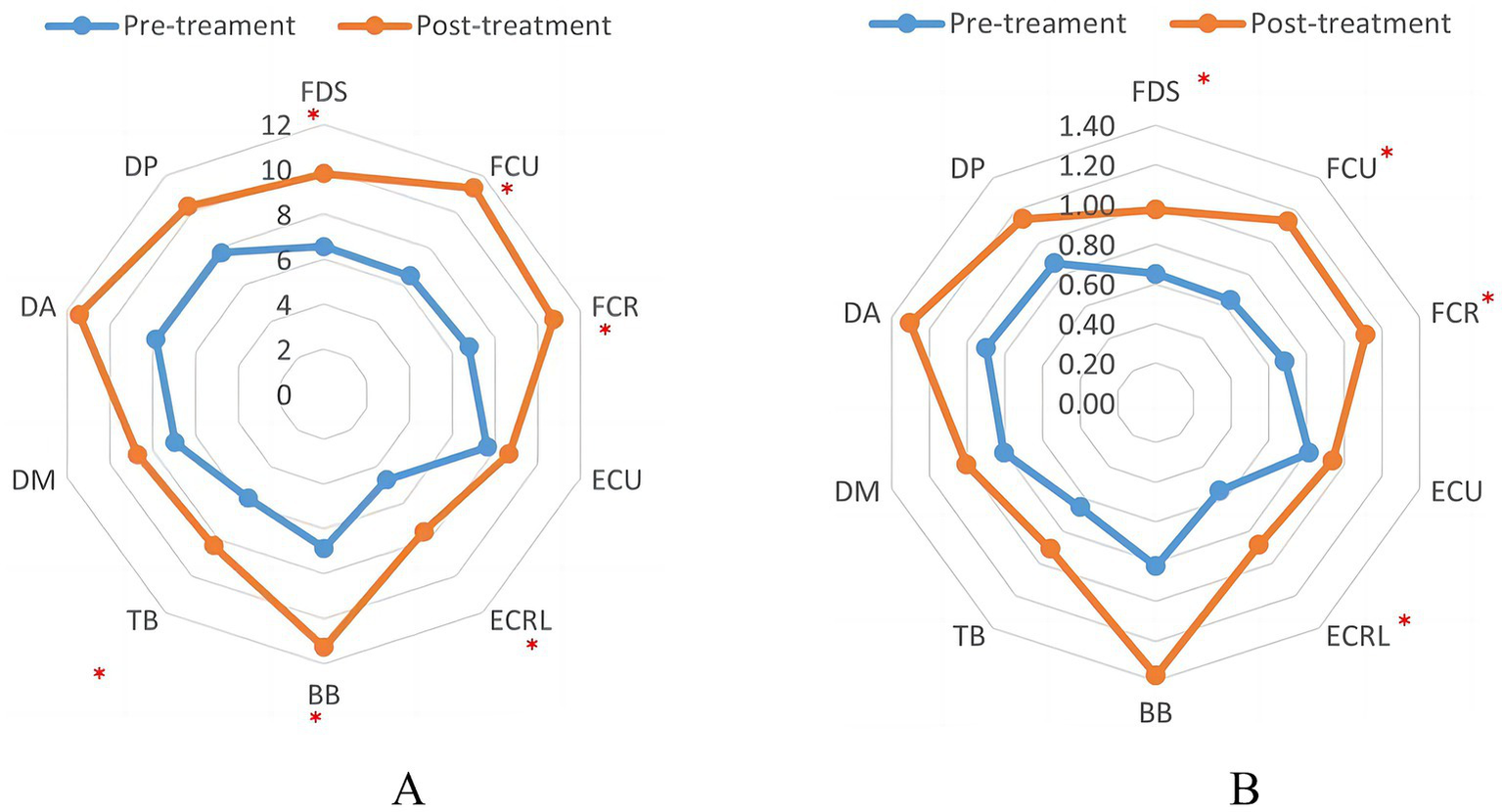 | Pre-treatment | Post-treatment | Pre-treatment | Post-treatment | |||||