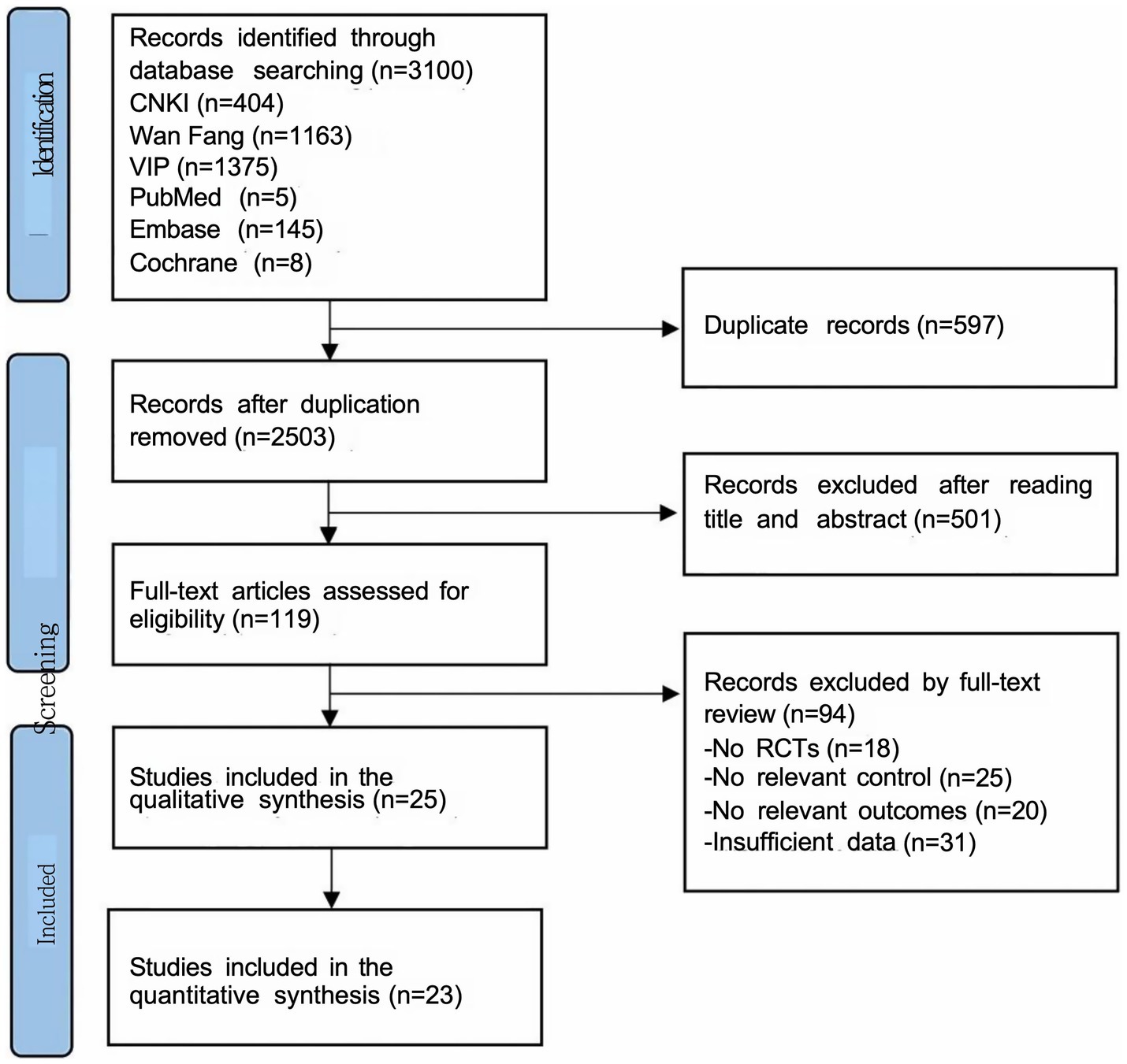 The study selection process is illustrated in Figure 1 following the PRISMA guidelines for systematic reviews. Our initial comprehensive database search identified a total of 3,100 potentially relevant publications across multiple electronic databases. Following the removal of 597 duplicate records through EndNote reference management software and manual verification, we proceeded to screen the remaining 2,503 unique records. During the initial screening phase, two independent reviewers systematically evaluated the titles and abstracts against our predefined inclusion criteria, resulting in the exclusion of 2,002 records. This rigorous screening process yielded 501 potentially eligible articles for full-text assessment. In the subsequent phase, the research team conducted a thorough examination of the full texts of these 501 articles. This detailed evaluation process led to the exclusion of 476 publications that failed to meet our inclusion criteria, primarily due to reasons such as inappropriate study design, irrelevant interventions, or inadequate outcome measures. Ultimately, 25 high-quality RCTs were identified as meeting all inclusion criteria and were selected for qualitative synthesis in our systematic review. In these RCT studies, data from weeks 1 through 4 were included in the quantitative synthesis, which comprised a total of 23 studies.