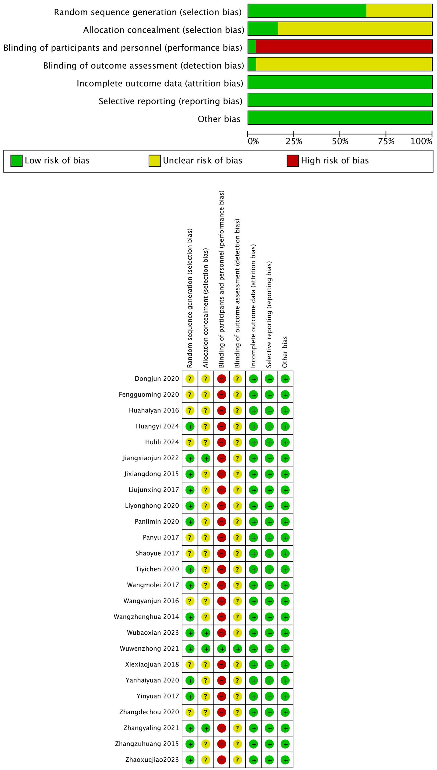 This study assessed the quality of 25 randomized controlled trials using the Cochrane Risk of Bias tool. Regarding random sequence generation, 11 studies (15–25) employed the random number table method, 3 studies (26–28) used sealed envelope randomization, and 2 studies (13, 29) generated random numbers via computer. The remaining 9 studies (12, 14, 30–36) only mentioned the term “randomization.” For allocation concealment, 4 studies (13, 26–28) used sealed opaque envelopes, while the remaining 21 studies did not clearly report allocation concealment methods. Regarding blinding of researchers and participants, due to the limitations of the interventions, not all studies adopted double-blinding. Only one study (28) blinded the assessors, while the other 24 studies had a high risk of performance bias. For blinding of outcome assessors, one study (28) ensured that outcome assessors were blinded, whereas the remaining 24 studies did not explicitly report blinding of outcome assessors. In terms of incomplete outcome data, selective reporting, and other biases, all studies reported complete data, with no evidence of selective reporting or other biases. The overall risk of bias assessment indicated that the primary risks were concentrated in the lack of allocation concealment and blinding implementation, while random sequence generation and data completeness performed relatively well. The risk of bias was visualized using Review Manager 5.4 software, as shown in Figure 3.