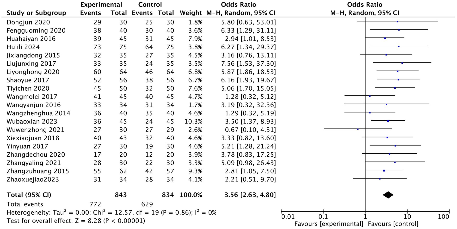 The efficacy observation index included in the literature was the effective rate of treatment. A dichotomous classification of count data was used to test the efficacy rates described in the literature. In this study, the effective rate of treatment was determined as the sum of the clinical cure rate, effective rate, and substantial effective rate recorded in the literature, and the ineffective rate was defined as the zero point of effective treatment. The results of 20 studies were tested for heterogeneity. The results showed that there was homogeneity among the studies, I2 = 0; The random effect model was used for statistical analysis, and the pooled OR value was 3.56. The rhomboid was located on the right side of the midline, 95% CI was [2.63, 4.80]; Z test: acupuncture group vs. control group Z = 8.28, p < 0.00001. As shown in Figure 4, the therapeutic effect of the acupuncture group was statistically different from that of the traditional western medicine treatment.