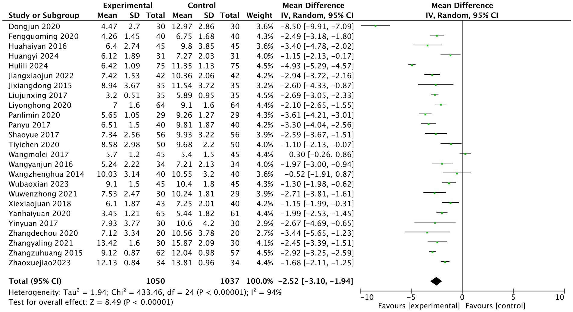 The heterogeneity test of the results of 25 studies showed that there was a high degree of heterogeneity among the studies (I2 = 94%). The random effect model was used for statistical analysis, and the diamond was on the left side of the midline. The pooled MD value was −2.52, and the 95% CI was [−3.10, −1.94]. Z test showed that the difference was statistically significant (Z = 8.49, p < 0.00001). After treatment, PSQI in the experimental acupuncture group was lower than that in the western medication control group, as shown in Figure 5 (PSQI score meta-analysis forest plot).