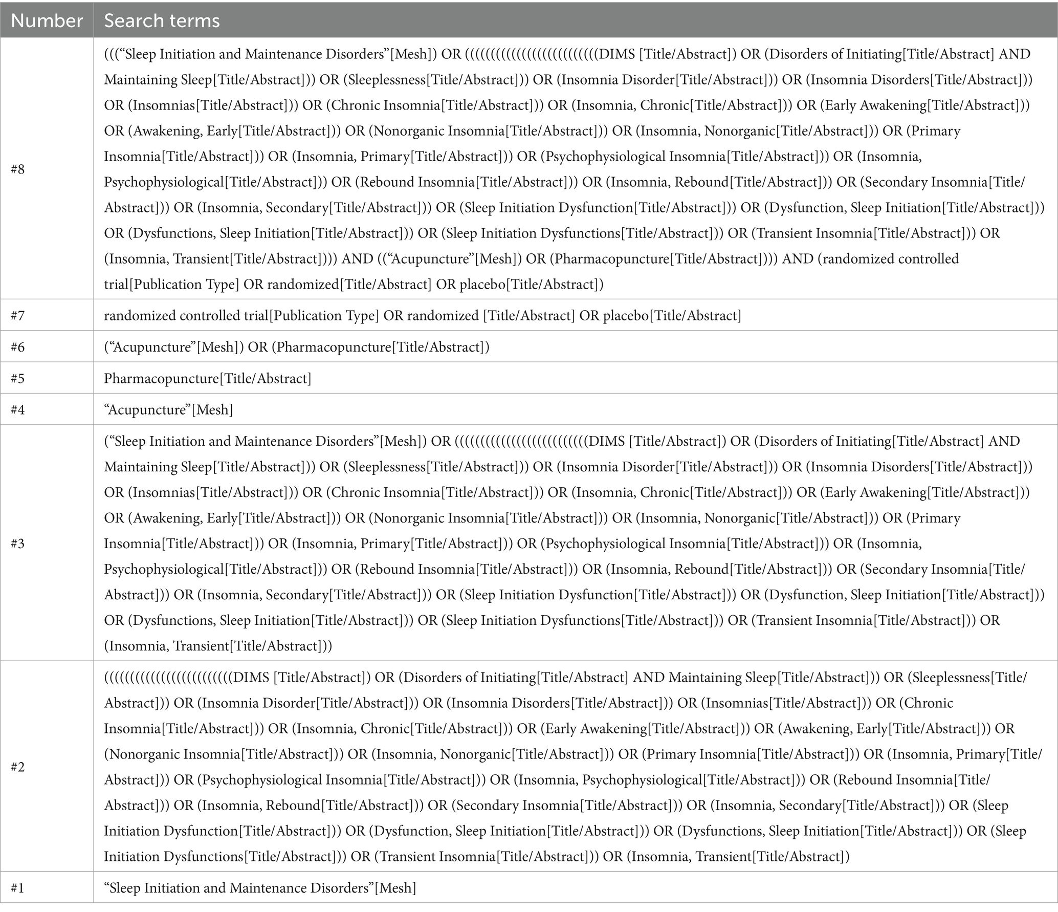 To identify RCTs investigating the therapeutic efficacy of acupuncture for insomnia disorder, we conducted a comprehensive systematic literature search across multiple electronic databases. The search spanned from January 2014 to December 2024 and included six major databases: VIP Database, Wanfang Data, Cochrane Library, Embase, PubMed, and CNKI. The search strategy was developed and executed by two independent reviewers with expertise in systematic review methodology. We employed a dual approach to database searching, utilizing both free-text keywords and standardized Medical Subject Headings (MeSH) terms to ensure maximum retrieval sensitivity. The broad search term “acupuncture” was initially adopted to meet the requirements of database retrieval strategies, ensuring the inclusion of various therapies such as manual acupuncture and electroacupuncture while avoiding omissions due to terminology differences or inconsistent indexing. Combined with disease terms like “insomnia” and “sleep disorders” as well as study type terms such as “randomized controlled trial,” this approach aligns with the PICOS framework for literature retrieval and ensures the accuracy of the research scope through subsequent manual screening. The search terms were acupuncture, acupuncture therapy, manual acupuncture, electroacupuncture, insomnia, sleep disorders, difficulty falling asleep, sleep initiation and maintenance disorders, randomized controlled trial and RCT in both Chinese and English. Boolean operators (AND, OR) were strategically employed to optimize search precision. The search strategy was adjusted for each database. To ensure transparency and reproducibility of our search methodology, we have provided a detailed example of our search strategy using PubMed in Table 1. This includes the specific search terms, field tags, and Boolean operators used.