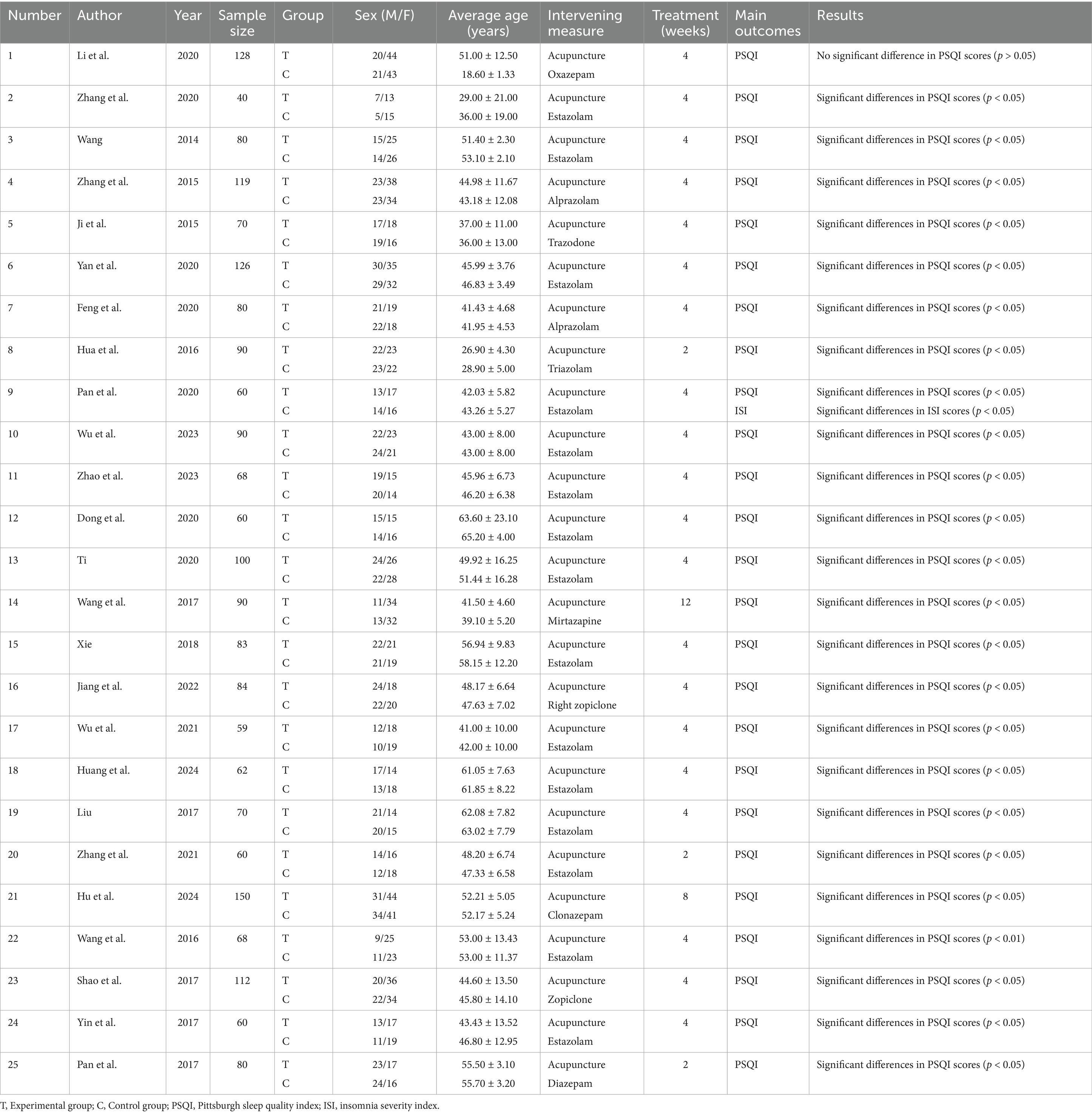This systematic review analyzed studies published from 2014 to 2024, encompassing a pooled sample of 2,087 participants across all eligible trials, as systematically presented in Table 2. The included publications were exclusively published in either English or Chinese, demonstrating the international scope of research in this therapeutic domain. All studies implemented rigorously standardized diagnostic protocols, diagnostic criteria of Western medicine include the Diagnostic and Statistical Manual of Mental Disorders, Fifth Edition (DSM-V) (9), the International Classification of Diseases, tenth revision (ICD-10) (10) diagnostic criteria for insomnia disorder, and the Chinese Classification and Diagnostic Criteria of Mental Disorders, third edition (CCMD-3) (11) established by the Chinese Society of Psychiatry. For TCM diagnostic criteria, the standard is based on the “Guidelines for the Diagnosis and Efficacy Evaluation of TCM Syndromes” issued by the State Administration of Traditional Chinese Medicine in 2012. Additionally, participants were required to have a PSQI score of ≥ 6. Treatment duration ranged from 2 weeks (12–14) to 12 weeks (15). The therapeutic interventions were systematically categorized into experimental and control modalities. The experimental groups received standardized acupuncture protocols. The control groups received standard Western medicine regimens, primarily consisting of benzodiazepines and non-benzodiazepine hypnotics, specifically alprazolam, diazepam, estazolam, and zolpidem, which represent the most commonly prescribed medications for sleep disorders in clinical practice. The quantitative synthesis, as detailed in Table 2, incorporated methodological rigor through the inclusion of 25 high-quality studies that directly compared the therapeutic efficacy of acupuncture versus pharmacological interventions. This comparative analysis enabled a comprehensive evaluation of both therapeutic modalities within a standardized methodological framework.