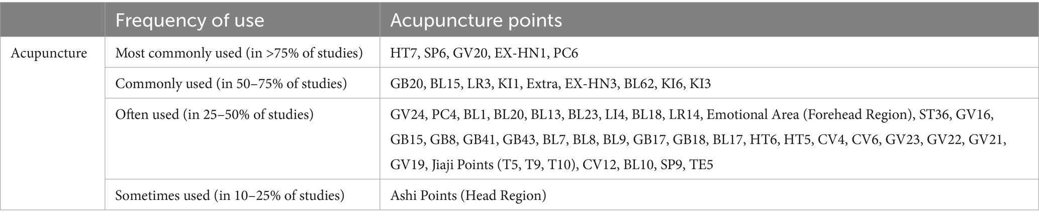 There is significant variability in the selection of acupoints across the included studies. A total of 25 articles were reviewed, identifying 52 acupoints. Among these, HT7, SP6, GV20, EX-HN1, and PC6 being the most frequently used (application rates >75%), followed by GB20, BL15, LR3, KI1, and others (>50%). Additional points like GV24, ST36, LI4, and Ashi points were also considered.