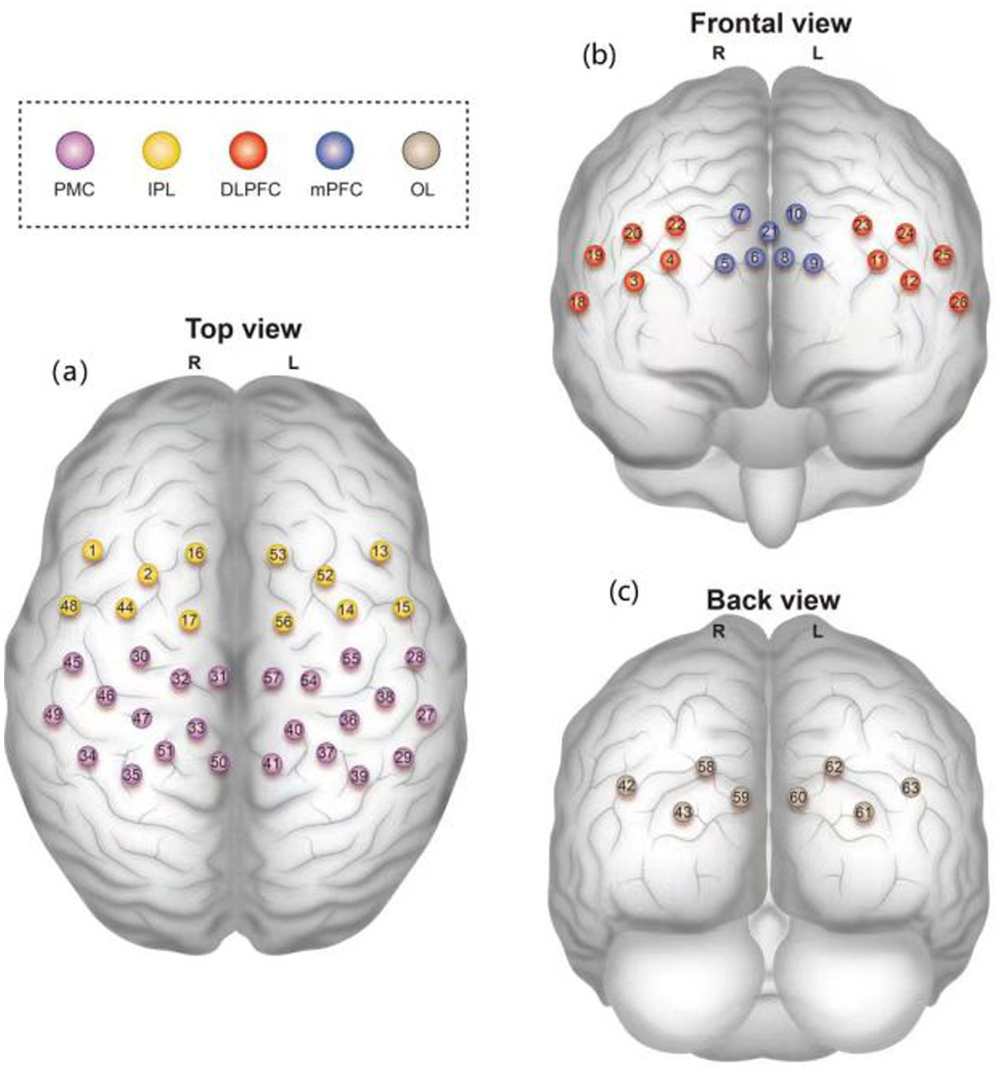 Figure 2. (a) Top view, (b) Frontal view, and (c) Back view of the brain regions covered by 63 fNIRS channels. Color-coded regions: dorsolateral prefrontal cortex (DLPFC, red), medial prefrontal cortex (mPFC, blue), premotor cortex (PMC, purple), inferior parietal lobe (IPL, yellow), and occipital lobe (OL, gray).