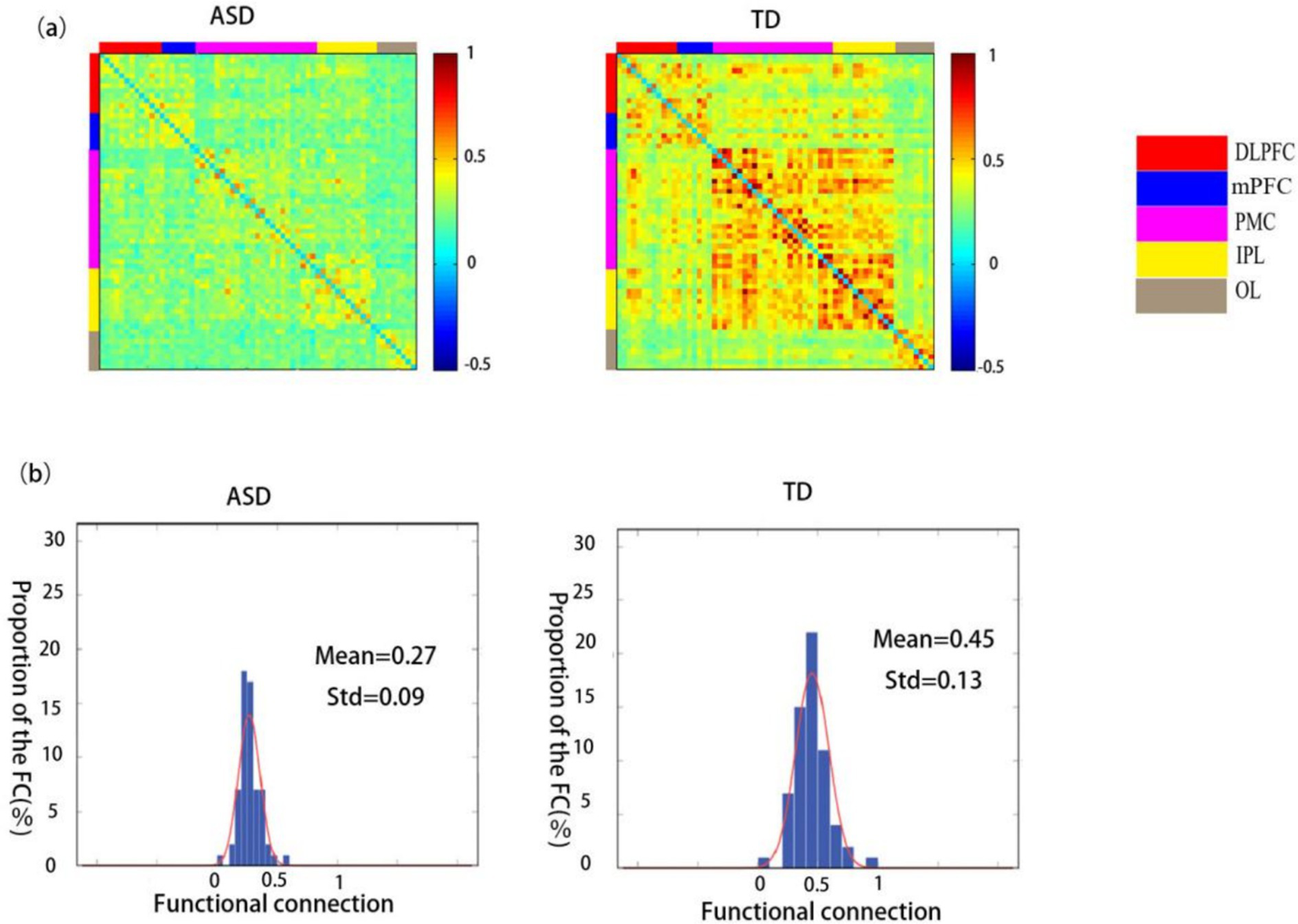 Figure 3. Spatial patterns of functional connectivity in the ASD and TD groups. (a) Functional connectivity maps for the ASD and TD groups. (b) Histograms of the functional connectivity distribution in the ASD and TD groups. TD: typically developing, ASD: autism spectrum disorder.