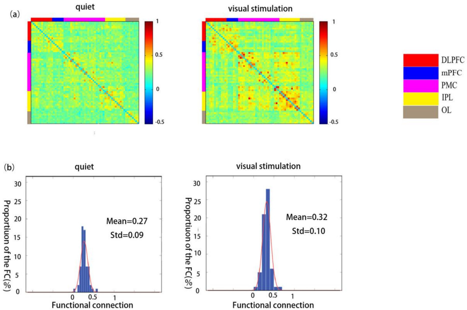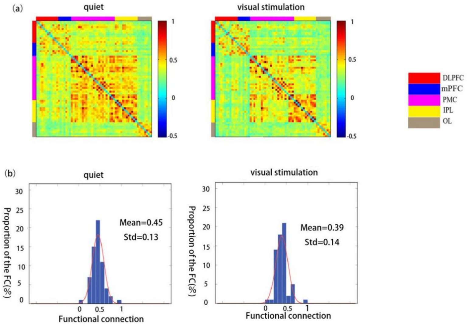 Figure 5. Spatial patterns of functional connectivity in the ASD group during quiet and visual stimulation state. (a) Functional connectivity maps of the ASD group. (b) Histograms of the functional connectivity distribution. TD: typically developing, ASD: autism spectrum disorder.