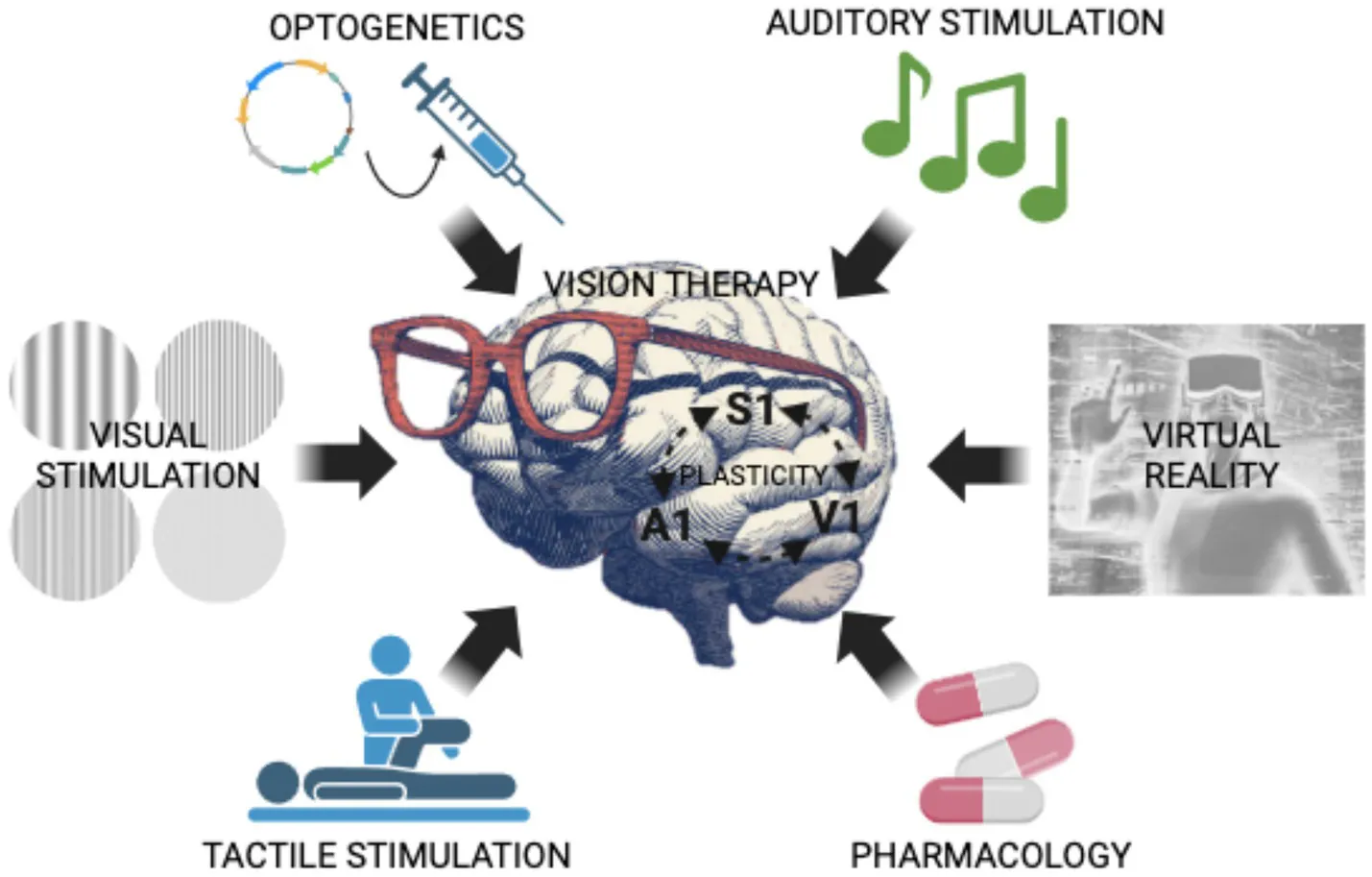 Illustration of cutting-edge techniques (i.e., optogenetics, auditory stimulation, visual stimulation, tactile stimulation, pharmacology, virtual reality) that promote brain plasticity and could be employed, alone or in combination, as vision recovery therapies in humans.