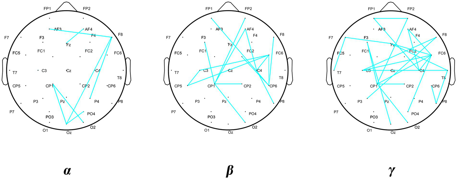 The results of the comparative analysis of the differences in PLI in the δ, θ, α, β, and γ bands between the DCD and TD boys revealed significant differences in PLI in the α, β, and γ bands between the groups, and the results of the comparison are shown in Figure 4. The differences in the figure are the mean differences in the PLI between specific channels for each group of subjects, and the strength of functional connectivity is indicated by color. There were significant differences in the PLI among the 7, 14, and 23 electrode pairs in the above three frequency bands, the results are shown in Figure 4 and Table 5. They are all connected by blue straight lines. For example: Fz to AF4 is connected by blue straight line, which represents a significant difference in the mean PLI from the frontal midline to the right frontal area between the two groups of children during VMI. The mean PLI values in the α (TD = 0.229 ± 0.004, DCD = 0.185 ± 0.003; p = 0.000), β (TD = 0.184 ± 0.006, DCD = 0.146 ± 0.007; p = 0.000), and γ (TD = 0.208 ± 0.011, DCD = 0.137 ± 0.011; p = 0.000) bands of the DCD boys were significantly lower than those of the TD boys as shown in Table 6. The statistical results suggested that the decrease in functional connectivity strength might be a potential influencing factor for DCD boys (see Figure 5).