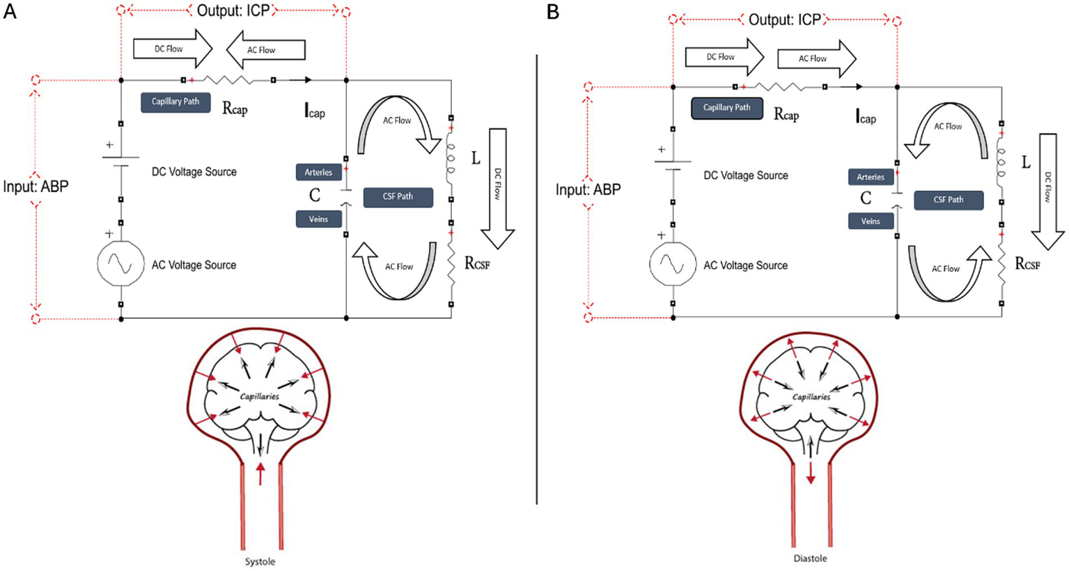 In our model, smooth blood flow is the equivalent of the direct current (DC) offset and corresponds physiologically to smooth mean cerebral blood flow (CBF), and pulsatile flow represents the alternating current (AC) flow and corresponds physiologically to pulsations of blood, CSF, and brain parenchyma. A schematic of our model simulating intracranial dynamics in systole and diastole is demonstrated in Figure 1 (15, 16).