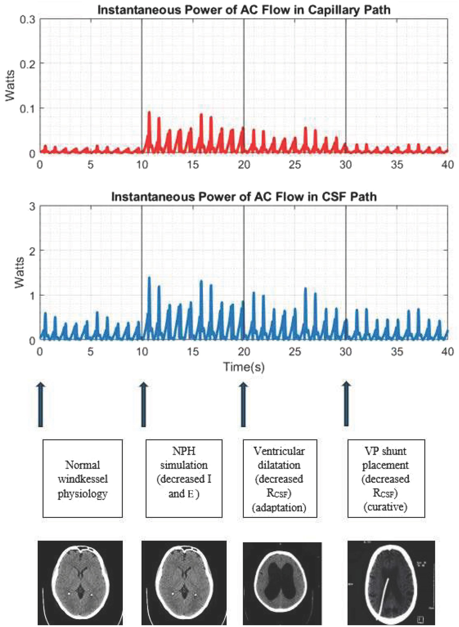 Simulation of the cerebral windkessel and perturbations to simulate NPH. At 0–10s, we demonstrate normal physiology, with negligible AC flow in the capillary path. At 10s, we decrease the intracranial inertance (I) and elastance (E) to simulate NPH, noting an increase in the amplitude of AC power in both the CSF and capillary paths. At 20s, we decrease resistance in the CSF path (a proxy for ventricular dilatation), which lowers the amplitude of AC power, albeit not to baseline. At 30s, we further lower resistance of the CSF path to simulate CSF shunting, a definitive treatment which provides another accessory windkessel and returns the intracranial pulse distribution to the physiological baseline.