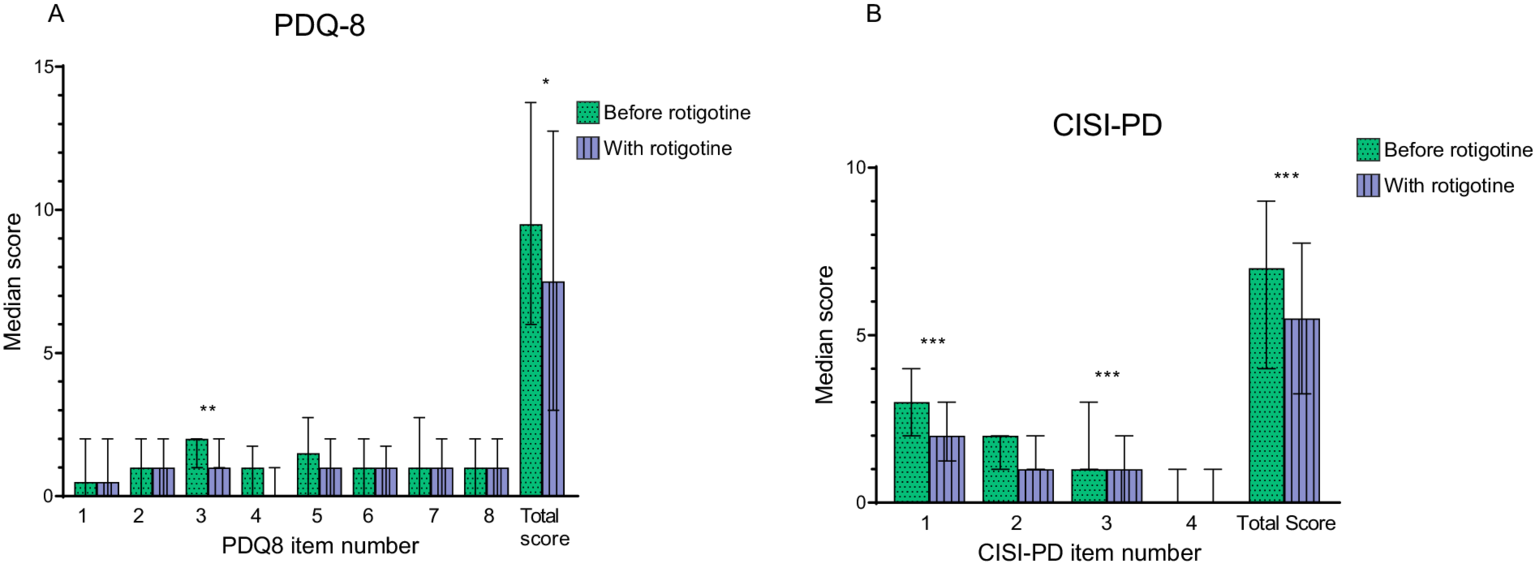 Motor complications and quality of life before and with rotigotine treatment according to questionnaires. Median values are presented resented, and error bars represent the interquartile range. Green bars with dots indicate scores before rotigotine treatment, while purple bars with lines indicate scores with rotigotine treatment. The total score is the sum of all item scores. Statistical significance is denoted as *p ≤ 0.05, **p ≤ 0.01, ***p ≤ 0.001, calculated using the Wilcoxon signed rank test. (A) Parkinson’s Disease Quality of Life Questionnaire (PDQ-8). Significant improvements were observed in question 3 (felt depressed, p = 0.07), and the total score (p = 0.014). (B) Clinical Impression of Severity Index for Parkinson’s Disease (CISI-PD). Significant improvements were observed in question 1 (motor signs), question 3 (motor complications including dyskinesia and fluctuations), and the total score (p = 0.001, p < 0.001, and p < 0.001).