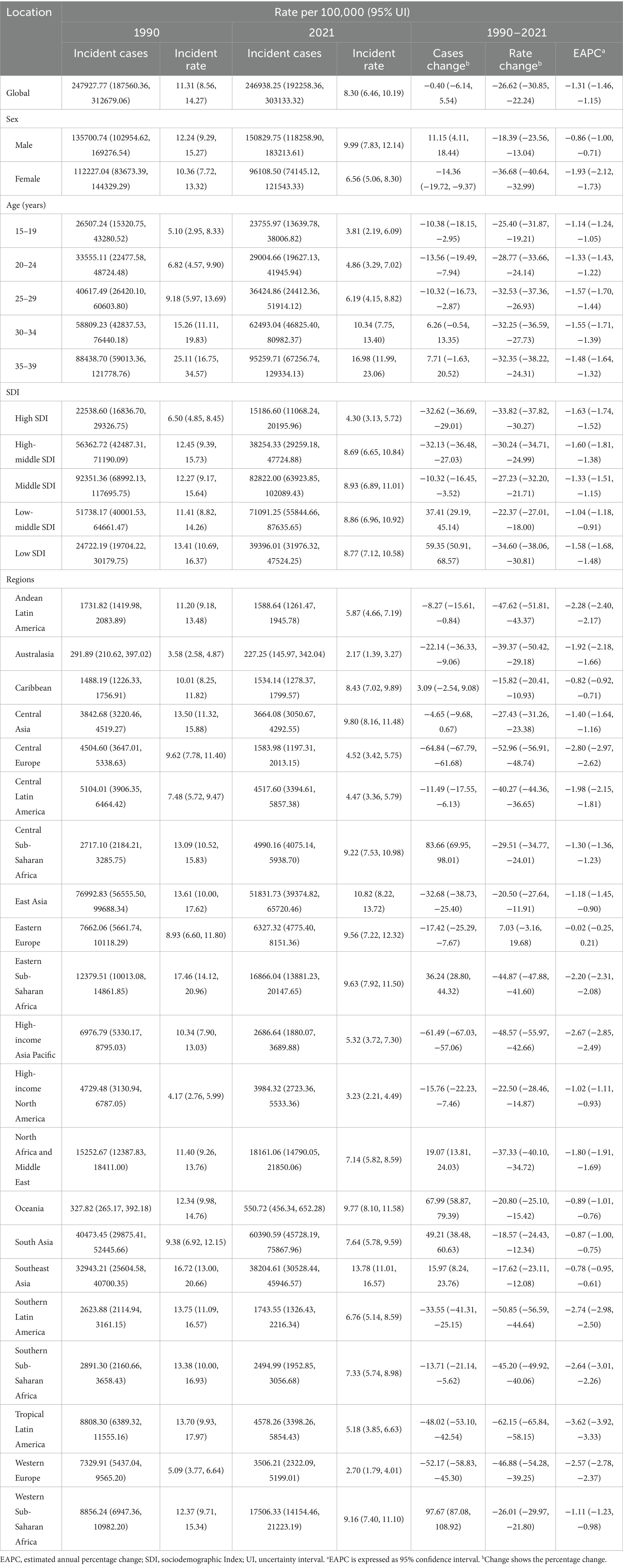 Although existing research has explored the global impact of ICH (5), there is a lack of studies focusing on the 15–39 age group. The 15–39 age group is a crucial stage in an individual’s life, as it encompasses key milestones such as educational attainment, career development, and the establishment of social relationships. Our study aims to provide the most up-to-date and comprehensive epidemiological analysis of ICH in youths and young adults by utilizing the latest Global Burden of Disease (GBD) 2021 dataset and employing advanced statistical methods such as Estimated Annual Percentage Change (EAPC). These methods enable us to assess temporal trends and offer a forward-looking perspective on the ICH burden in this age group.