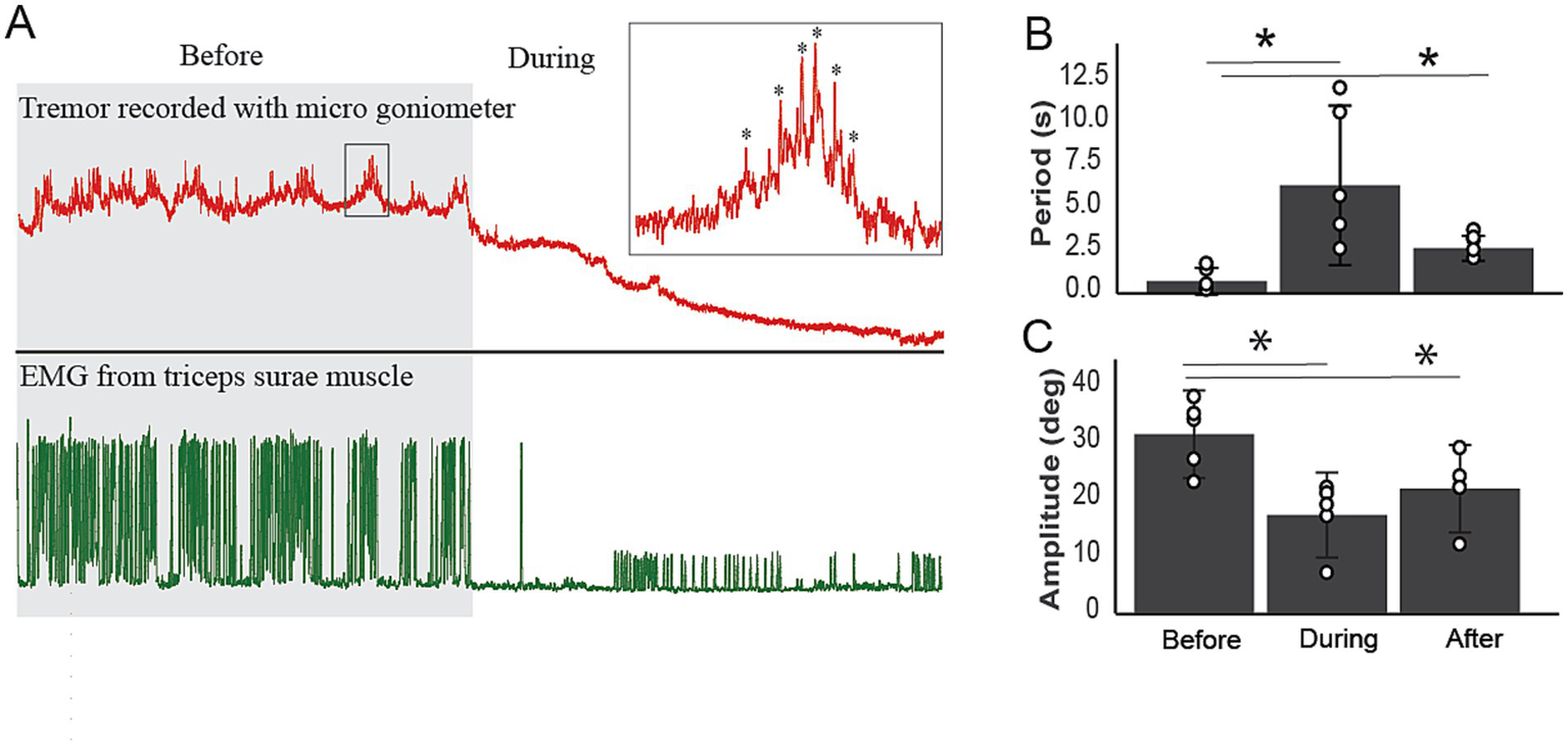 The immediate effects of A-MultiPath-DCS on tremor in the hindlimbs. A microgoniometer recorded tremors to measure the oscillations of the paw. At a range of current intensities (0.5 to 1.5 mA), tremors mostly disappeared. Higher intensities (>1.5 mA) cause the reappearance of tremors and intensify them. Therefore, in 5 animals, we used a current intensity of 1.5 mA to suppress tremors. (A) Example of tremor trace and concurrent EMG recorded before and during A-MultiPath-DCS. Note the complete reduction of tremors and the concurrent EMG. (B) The period of tremors was significantly increased during and after A-MultiPath-DCS (F(2,12) = 7.651, p = 0.014, Repeated Measure ANOVA). During stimulation, the period was increased from 0.77 to 6.4 s (p = 0.039), and remained high after stimulation ceased (2.7 s, p = 0.021). (C) The amplitude of tremors was reduced significantly, as shown in panel (C) (F(2,12) = 7.69, p = 0.014, Repeated measure ANOVA). During stimulation, the tremor amplitude is reduced from 31.4 to 17 uV, (p = 0.026). Following the end of stimulation, the amplitude is significantly lower (21.8 uV) compared to before stimulation (p = 0.008). This effect was maintained for at least 24 h following 60 min of A-MultiPath-DCS (data not shown). * indicates significance compared to before treatment.