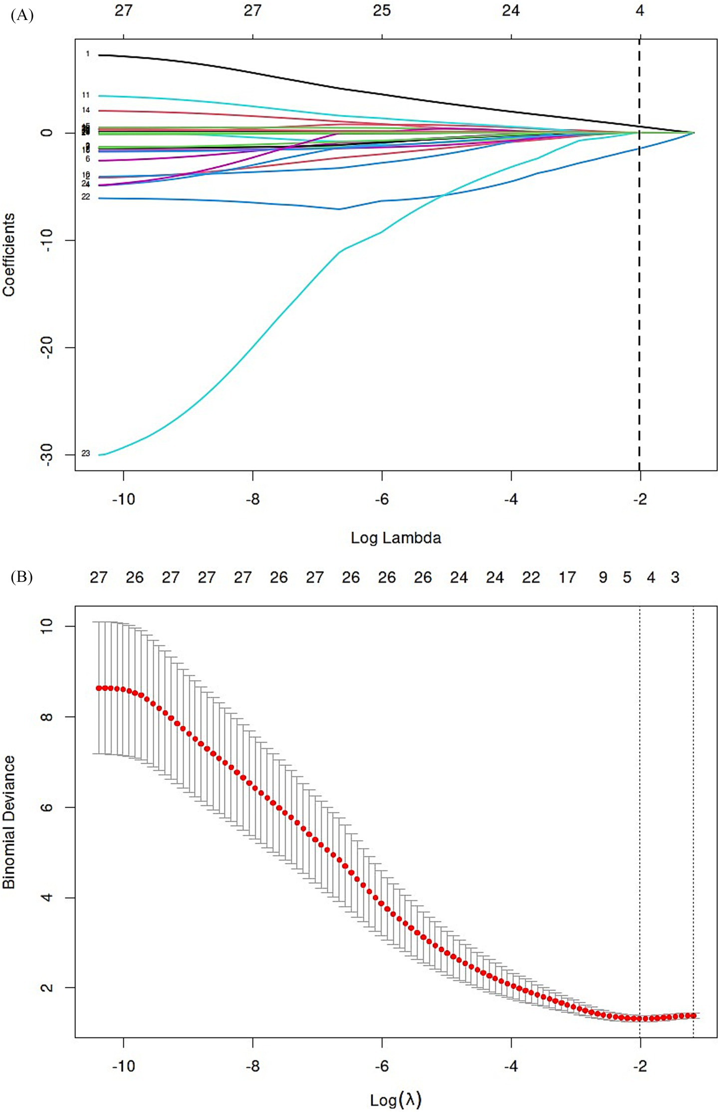 Figure 2. Elastic net regression and tenfold cross-validation were used to select the radiomics features. (A) Elastic net coefficient profiles of the radiomic features. (B) Optimal feature selection of mRS.