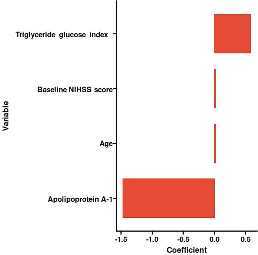 The 27 variables were screened by Elastic net regression (Figure 2A). When λ = 0.134, the following variables were selected for multivariate analysis: TyG index (Coefficient = 0.58221679), Age (Coefficient = 0.01415229), Apolipoprotein A-1 (Coefficient = −1.46789936), Baseline NIHSS score (Coefficient = 0.01621730) (Figure 2B). The details of the selected features were presented (Figure 3).