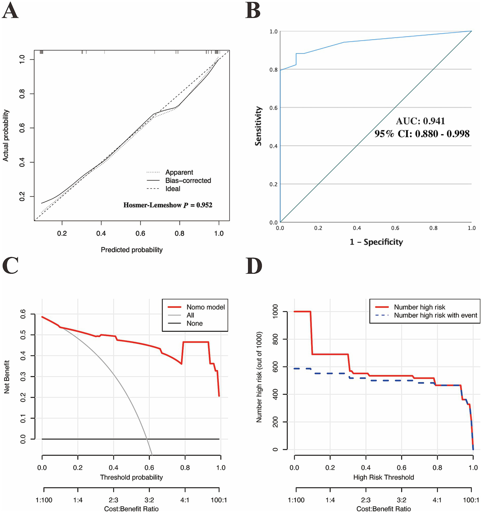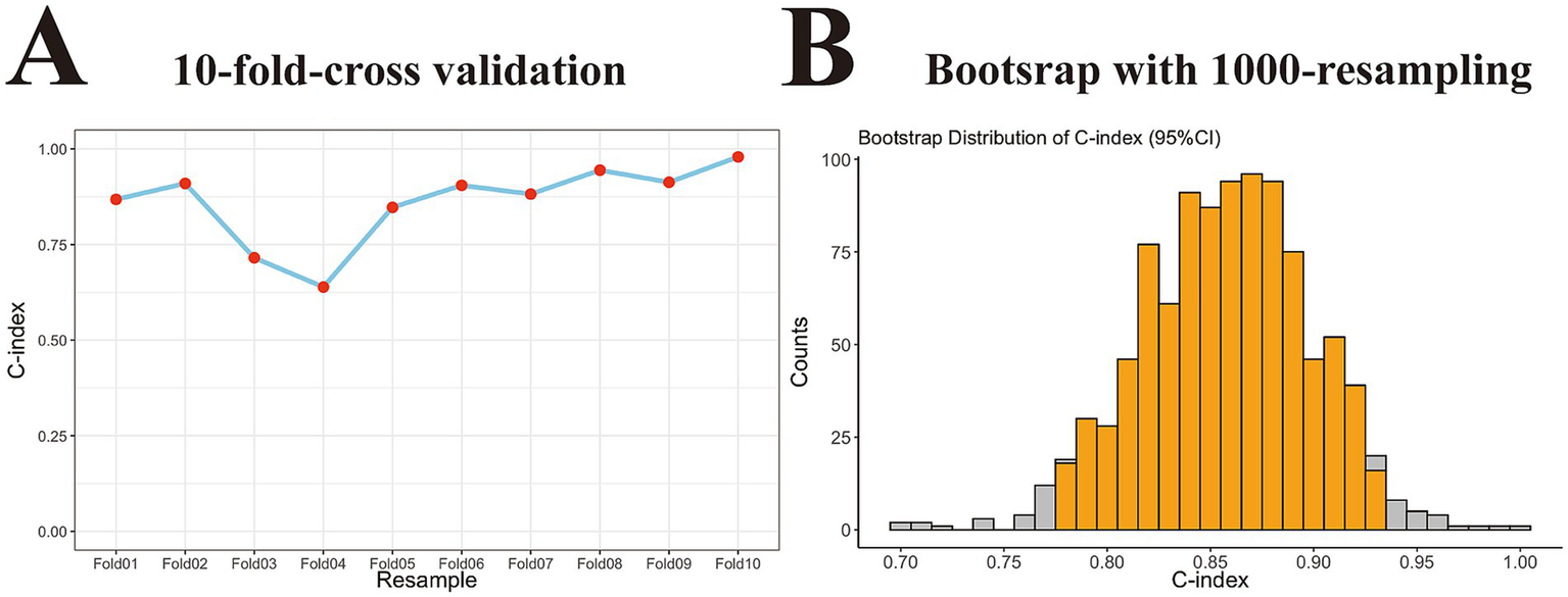 For internal validation of model performance, the receiver operating characteristic (ROC) curve and the area under curve (AUC) of the ROC were initially used to evaluate the discriminative performance of the model in the training cohort. Subsequently, calibration curves coupled with the Hosmer-Lemeshow test were applied to assess the goodness-of-fit between predicted and observed data. A p value from the Hosmer-Lemeshow test <0.05 indicated that the dotted line (representing model-predicted data) significantly differed from the solid line (representing actual observed data) in calibration curve, demonstrating poor model fit; conversely, a p value >0.05 implied good model fit. Additionally, the clinical applicability of the nomogram was evaluated through decision curve analysis (DCA) and clinical impact curve (CIC). Furthermore, we used two methods to assess consistency and mitigate overfitting bias: the 10-fold cross-validation and bootstrap resampling (with 1,000 bootstrap resamples). The 10-fold cross-validation approach is a common and robust resampling technique used to assess the consistence performance and internal stability of predictive model, and involves partitioning the dataset into 10 mutually exclusive and approximately equal-sized folds. During iterative training, 9 folds are used as the training set while the remaining fold serves as the validation set. This process is repeated across all folds. The established performance metric, concordance index (C-index), is calculated to examine the consistency (generalization) and stability of predictive model. Conversely, the bootstrap sampling method, a classical internal validation method, draws from the original training dataset with replacement and undergoes 1,000 repetitions. C-index values greater than 0.7 from both methods indicated the nomogram had good reliability (28).