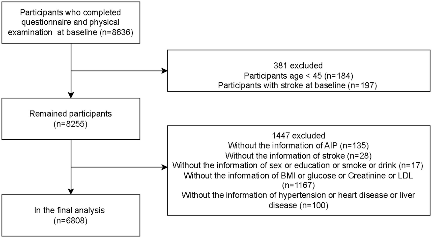 Given the severe threat posed by stroke, early identification and management of risk factors are essential to mitigate stroke risk (11). Numerous studies have established a robust association between stroke and atherosclerosis (12, 13). Historically, evaluations of cardiovascular risk and atherosclerosis have predominantly focused on low-density lipoprotein cholesterol (LDL-C) and HDL-C measurements (14). Nonetheless, clinical observations reveal that achieving target LDL-C levels does not fully mitigate cardiovascular or cerebrovascular risks (15). Hypertriglyceridemia commonly coexists with decreased HDL-C concentrations, potentially exacerbating residual cardiovascular risks (16). The AIP, calculated as the logarithmic ratio of TG to HDL-C, precisely captures the lipid metabolism balance and presents considerable benefits compared to traditional lipid parameters (17). Research has consistently linked elevated AIP values to heightened risks of cardiovascular and cerebrovascular events, particularly major artery atherosclerotic ischemic stroke (18, 19). Nevertheless, prior studies have notable limitations: participants were often limited to specific populations such as obese individuals (20) and those with stage 0–3 cardiovascular-renal-metabolic (CKM) disease (21); data were collected from restricted communities (22) or individual medical institutions (23); and study designs were primarily cross-sectional (24), limiting their ability to establish a causal relationship between AIP and stroke risk. Currently, cohort studies exploring the association between AIP and stroke remain limited, and the possible nonlinear nature of this relationship and subgroup variations have not been thoroughly investigated. Therefore, investigating these relationships would address existing research gaps and provide empirical evidence for targeted intervention strategies and improved resource allocation in healthcare.
