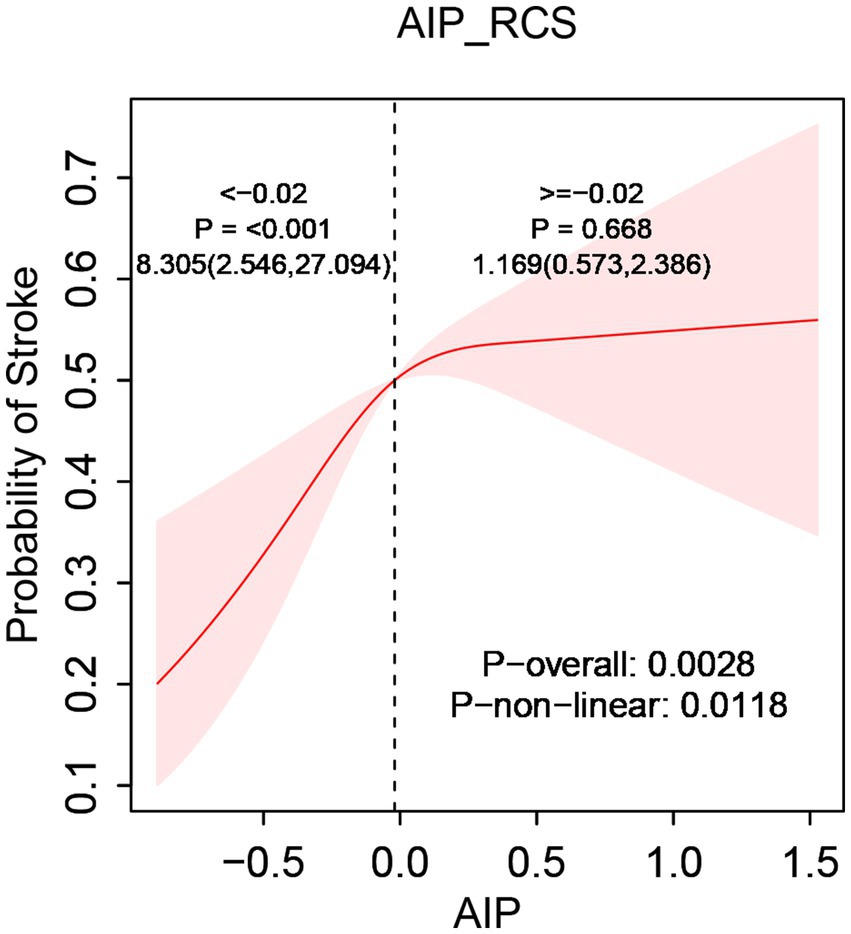 After comprehensive adjustment for confounders, RCS regression further clarified the relationship between AIP and stroke incidence, highlighting a nonlinear positive association (p-nonlinear < 0.05). Threshold analysis pinpointed an inflection at an AIP level of −0.02, notably lower than the traditional “low-risk” criterion (AIP < 0.11) previously defined in literature (41). This finding suggests that even within the conventional “normal” AIP range, stroke risk sharply increased as AIP rose from its lowest value up to −0.02 (OR = 8.305, 95% CI [2.546, 27.094]). After surpassing the inflection point, the risk increase rate slowed significantly (OR = 1.169, 95% CI [0.573, 2.386]). Consequently, an AIP of −0.02 represented not merely a statistical inflection point but potentially a “high-risk-normal” state within the normal reference range. Clinically, this threshold might indicate the need for intensified monitoring or early intervention even when AIP remains conventionally normal (Figure 2).