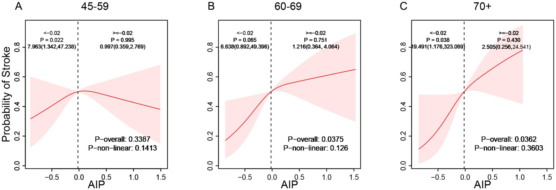 Despite these significant findings, several limitations warrant consideration. First, stroke outcomes partly depended on self-reported data. Post-event verification could result in misclassification or underreporting. Second, despite adjustments for numerous established risk factors, residual confounding, especially from unmeasured or unknown variables, could not be completely ruled out due to observational study limitations. Third, the study exclusively included a Chinese population, limiting the generalizability of findings to other ethnic groups. Fourth, participants were exclusively middle-aged or elderly (≥45 years), excluding younger age groups. Thus, generalization to broader populations requires caution. Future research should employ more precise outcome measures, comprehensive strategies to manage confounding variables, and validate results across diverse cohorts. Additionally, investigating the biological mechanisms linking AIP to stroke risk is needed. Nonetheless, this study holds substantial clinical value as the first investigation identifying a nonlinear association between AIP and stroke in middle-aged and elderly Chinese populations. Its findings provide new insights into using AIP for primary stroke prevention and risk management.