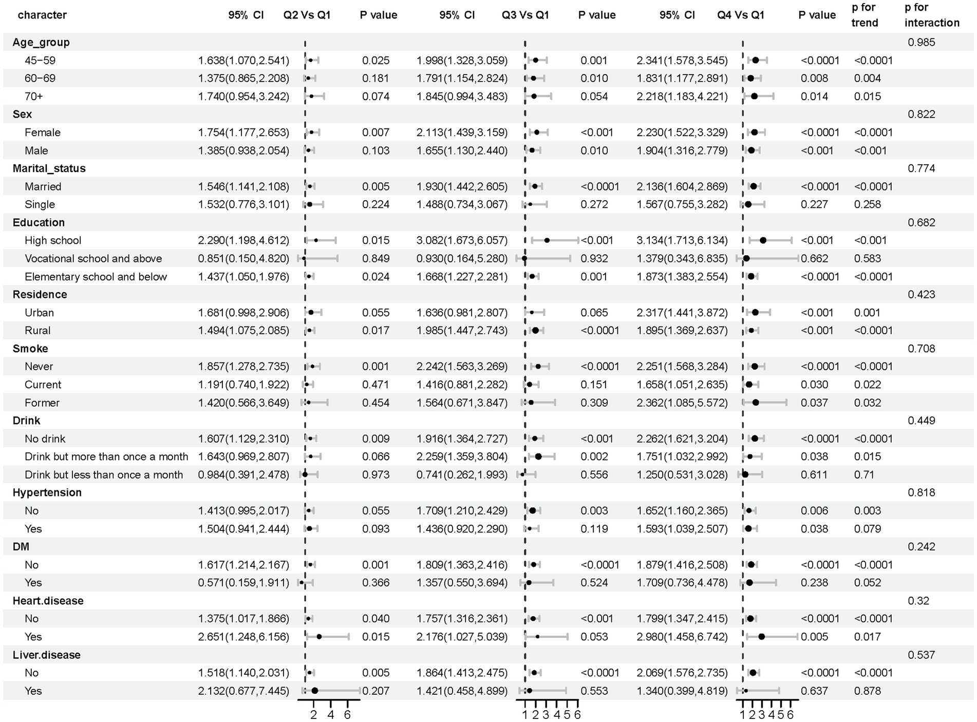 To evaluate the reliability and consistency of the identified relationship between stroke and AIP, stratified subgroup analyses were conducted and summarized in a forest plot (Figure 5). The results demonstrated consistent associations across all subgroups stratified by age, sex, marital status, education, residence, smoking status, drinking habits, hypertension, diabetes, heart disease, and liver disease, and no significant interaction terms were detected (interaction p-values > 0.05), further confirming the robustness of the relationship between AIP and stroke occurrence.