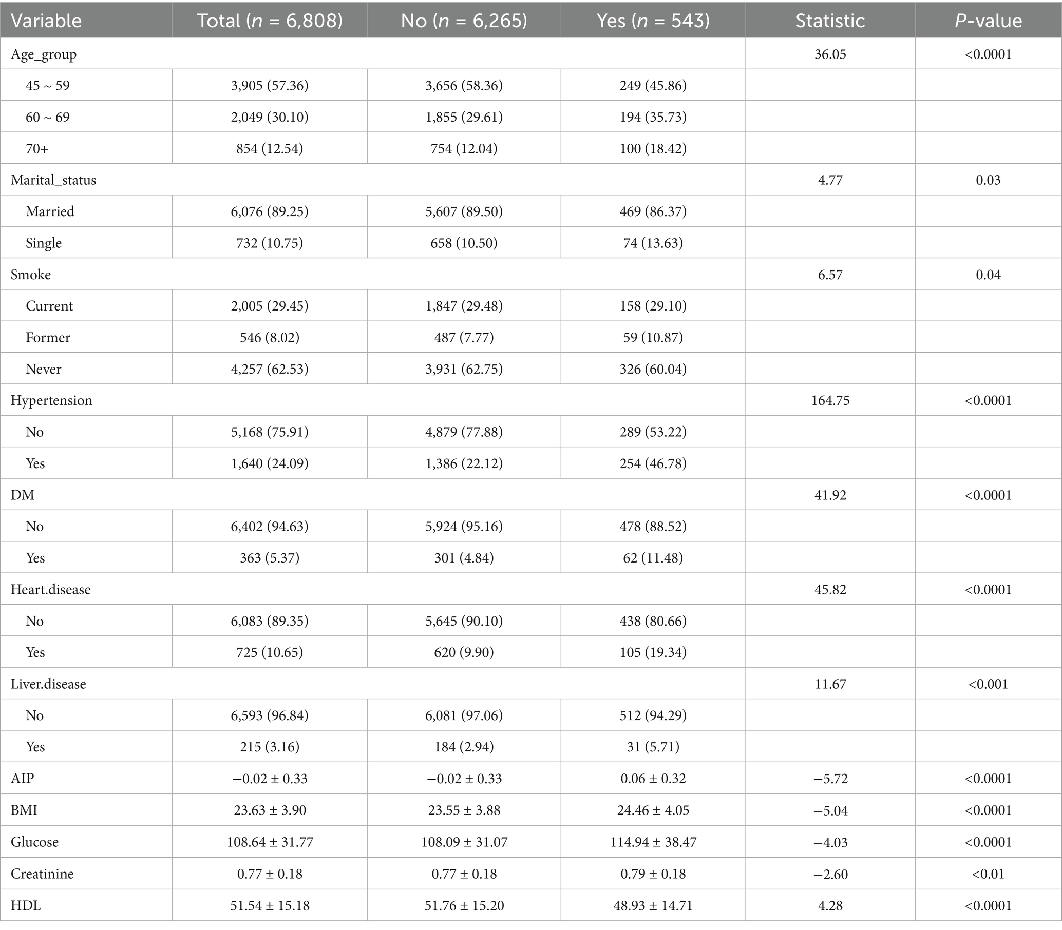 Table 1 presents baseline characteristics of the 6,808 middle-aged and older participants. Of these, 3,042 (44.68%) were male, and 3,766 (55.32%) were female. During follow-up, 543 cases (7.98%) of new-onset stroke were identified, with 46.78% occurring among males and 53.22% among females. Further analysis of participants by age group indicated that the largest proportion was aged 45–59 (57.36%), followed by those aged 60–69 (30.10%) and ≥70 years (12.54%). Most participants were married (89.25%), resided in rural areas (65.98%), and had primary education (69.79%). Stroke incidence was associated with age, marital status, smoking, BMI, blood glucose, creatinine, HDL levels, hypertension, diabetes, heart disease, and liver disease (p < 0.05). Clinical characteristics stratified by AIP values (see Supplementary Table S1) demonstrated statistically significant correlations with age, sex, marital status, education, residence, smoking status, drinking habits, BMI, glucose, creatinine, HDL, heart disease, hypertension, and diabetes (p < 0.05).