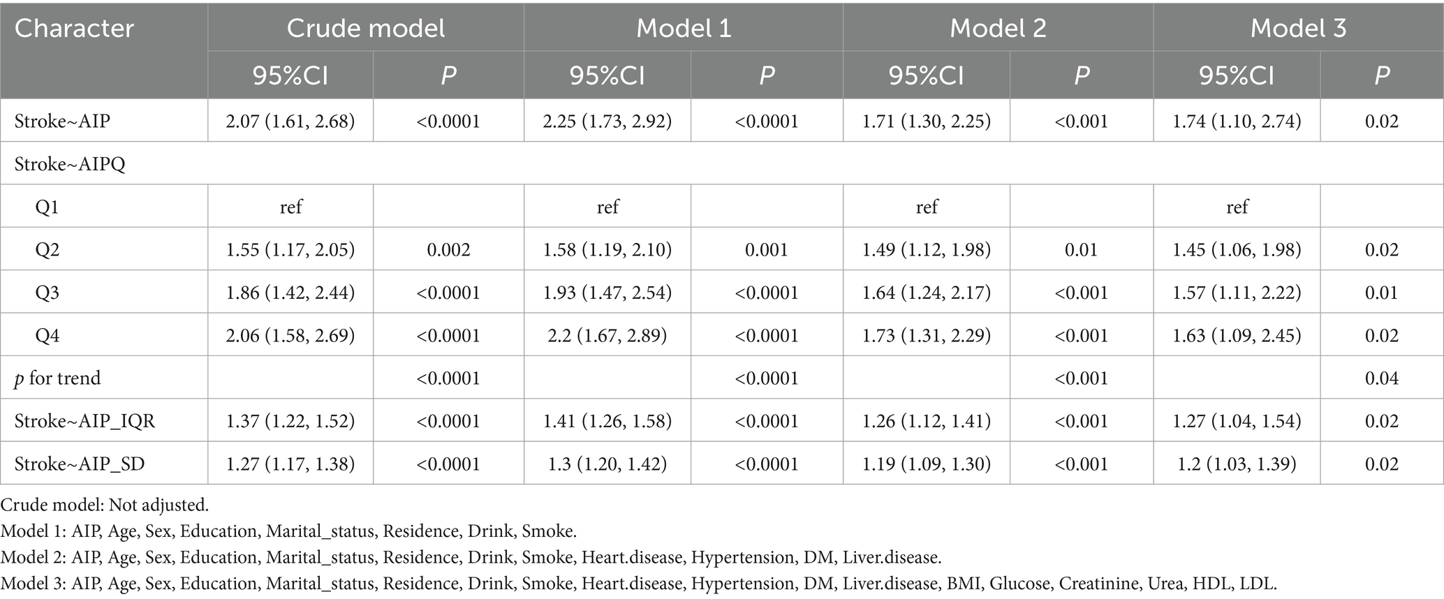 To control for potential confounding factors, a stepwise adjustment approach was employed. After adjusting for age, sex, education, residence, marital status, smoking status, drinking habits, hypertension, diabetes, heart disease, liver disease, BMI, glucose, creatinine, urea, HDL, and LDL in the final model, stroke incidence remained significantly elevated by 45% (OR = 1.45, 95% CI [1.06, 1.98], p = 0.02), 57% (OR = 1.57, 95% CI [1.11, 2.22], p = 0.01), and 63% (OR = 1.63, 95% CI [1.09, 2.45], p = 0.02) across the second, third, and fourth quartiles of AIP, respectively. Additionally, when analyzed as a continuous variable, each interquartile range (IQR) increase in AIP corresponded to a 27% greater stroke risk (OR = 1.27, 95% CI [1.04, 1.54]). Similarly, each standard deviation (SD) increase in AIP was associated with a 20% higher stroke risk (OR = 1.20, 95% CI [1.03, 1.39]) (Table 2).