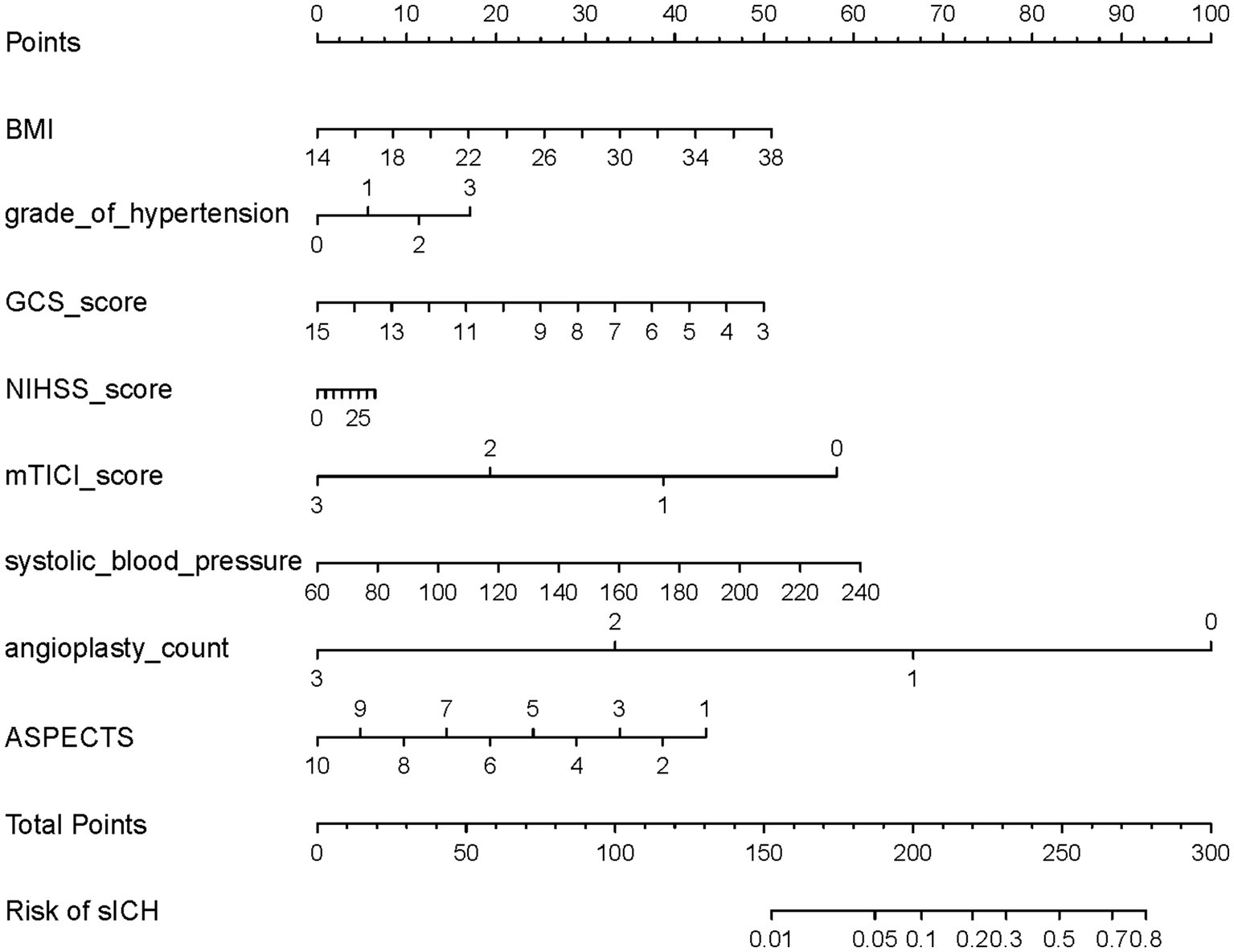 ICH is a common complication following EVT that has been established as an independent risk factor affecting patient prognosis, and symptomatic intracranial hemorrhage (sICH) represents a more severe form (6, 10–12). Identifying risk factors influencing the occurrence of ICH and sICH after EVT in TL patients can aid clinicians in timely recognition and intervention, thereby controlling the progression of surgical outcomes. This can prevent situations where hemorrhage after EVT impacts antiplatelet therapy or necessitates surgical intervention due to sICH, both of which severely compromise patient outcomes (5, 9–11, 13, 14).