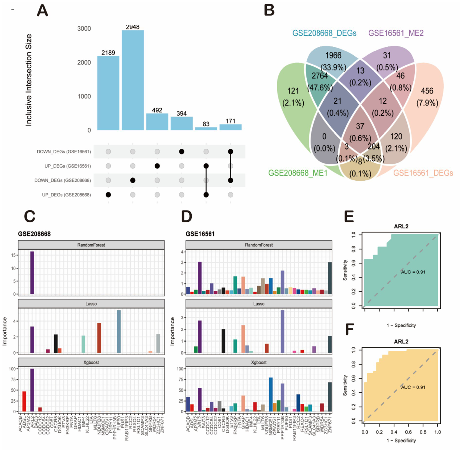 Screening of key candidate genes and validation of their diagnostic efficacy. (A) Bar plot showing the number of differentially expressed genes (DEGs) identified from the sleep disorder (SD, GSE208668) and ischemic stroke (IS, GSE16561) datasets. (B) Venn diagram illustrating the intersection of four gene sets: GSE208668-DEGs, GSE16561-DEGs, GSE208668_ME1 genes, and GSE16561_ME2 genes, yielding 37 high-confidence candidate genes. (C,D) Feature importance analysis of candidate genes using machine learning algorithms. (C) Results from the SD dataset (GSE208668). (D) Results from the IS dataset (GSE16561). The ARL2 gene was consistently identified as the top-ranked feature by all three algorithms (RandomForest, LASSO, and XGBoost). (E,F) Validation of the diagnostic performance of ARL2 using ROC curve analysis. (E) ROC curve for ARL2 in classifying SD samples from controls in the GSE208668 cohort (AUC = 0.91, 95% CI: 0.8166–1). (F) ROC curve for ARL2 in classifying IS samples from controls in the GSE16561 cohort (AUC = 0.91, 95% CI: 0.8467–0.9824).