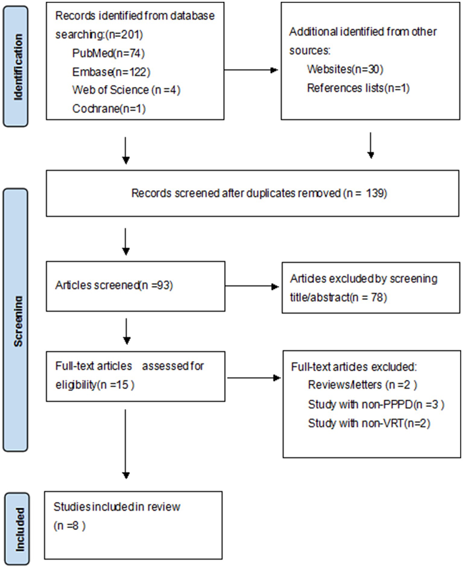 A total of 232 citations were identified, and only the titles and abstracts were deemed acceptable. The whole texts of possibly pertinent publications were reviewed. Table 1 enumerates the characteristics of the included studies, whereas Figure 1 illustrates the flowchart of the literature search. Following the elimination of duplicates, 93 items remained, while 78 articles were removed through the screening of titles and abstracts. Two reviews, three non-PPPD studies and two non-VRT studies were excluded. The final eight full-text papers were evaluated according to the eligibility criteria.(Figure 1).