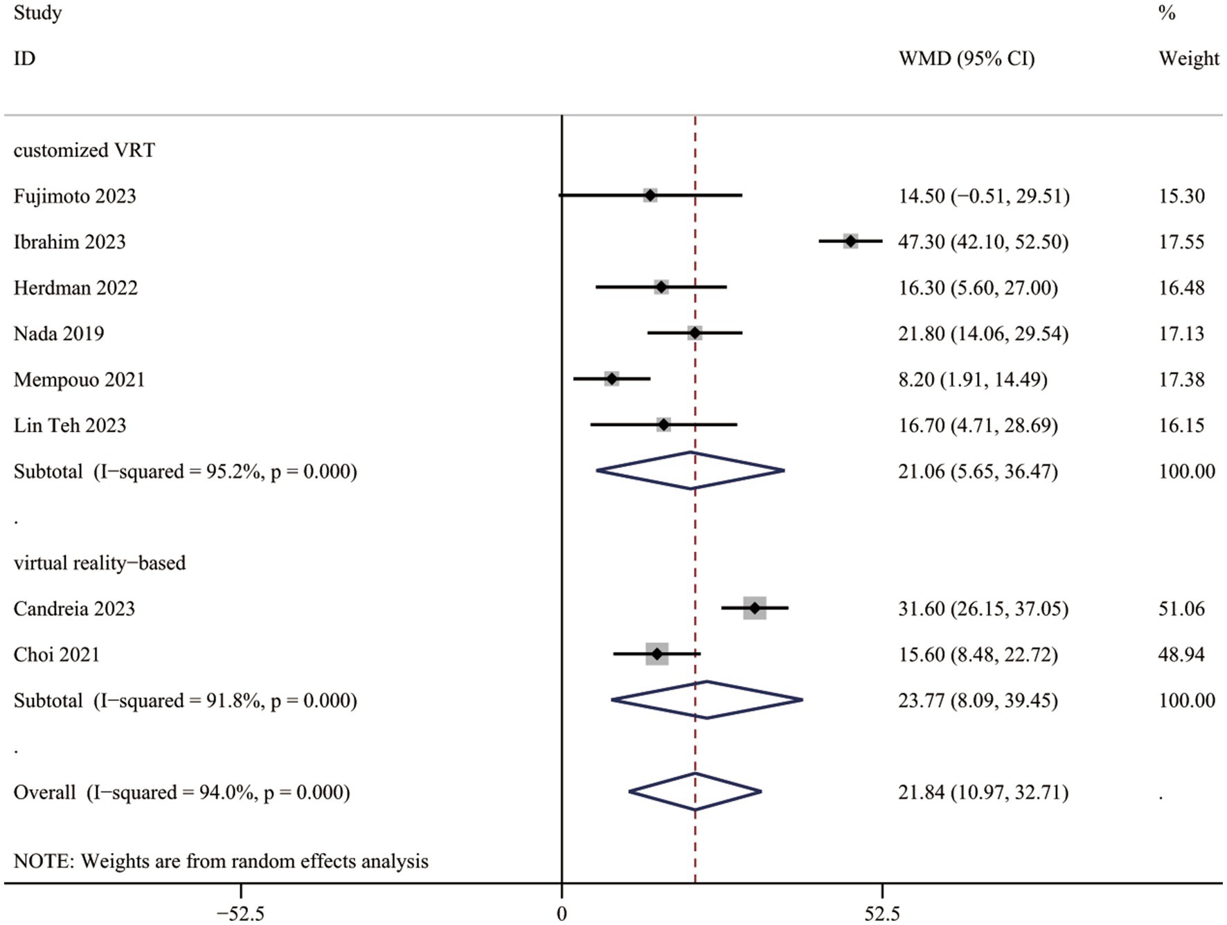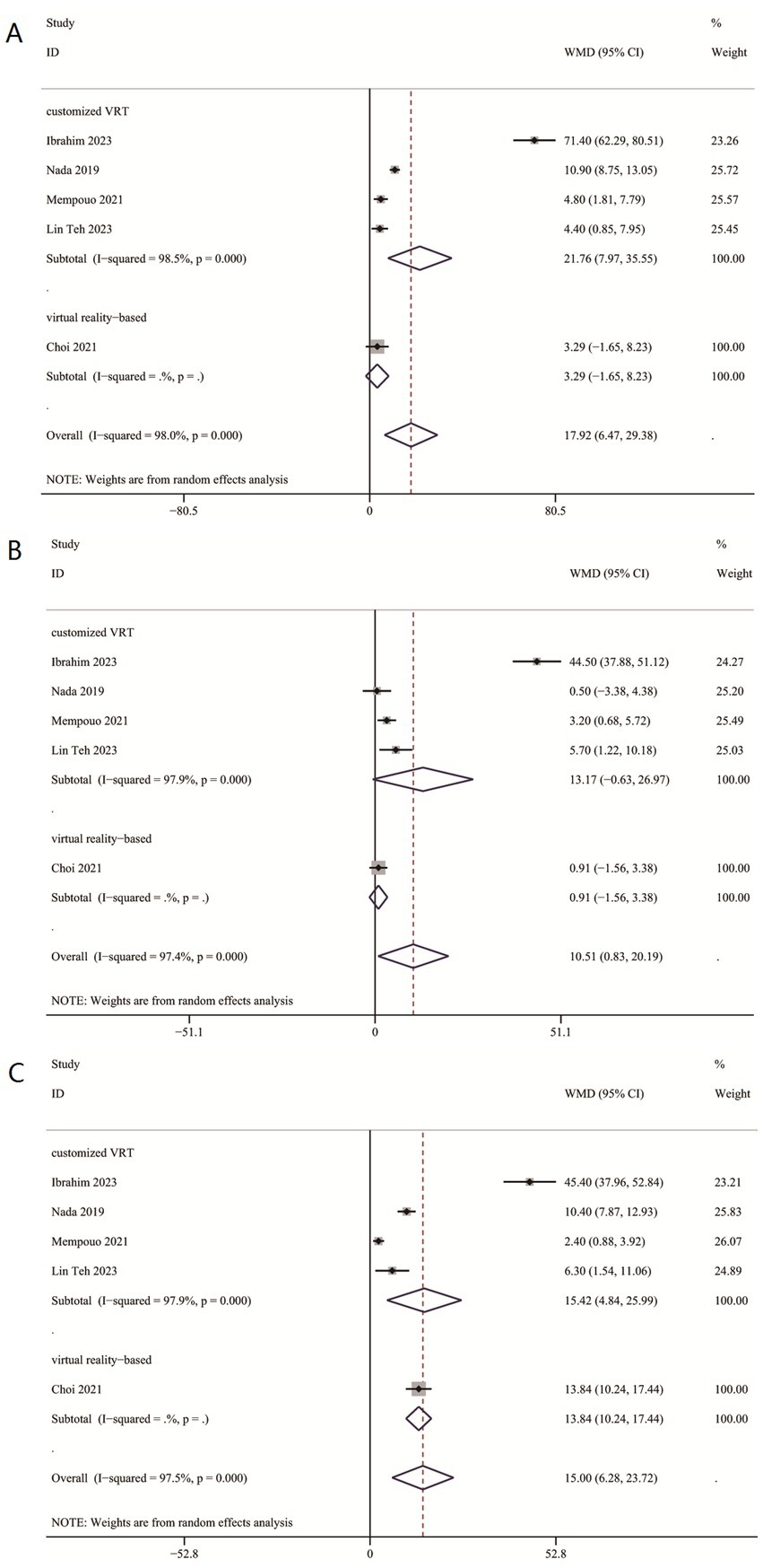 In subgroup analysis, customized VRT demonstrated significant reductions in both DHI-F (WMD = 15.42, 95%CI: [4.84, 25.99]) and DHI-P (WMD = 21.76, 95%CI: [7.97, 35.55]) scores, not in DHI-E (WMD = 13.17, 95%CI: [−0.63, 26.97]). Virtual reality-based VRT showed improvement in DHI-F scores (WMD = 13.84, 95%CI: [10.24, 17.44]), but not in DHI-E (WMD = 0.91, 95%CI: [−1.56, 3.38]) and DHI-P (WMD = 3.29, 95%CI: [−1.65, 8.23]).