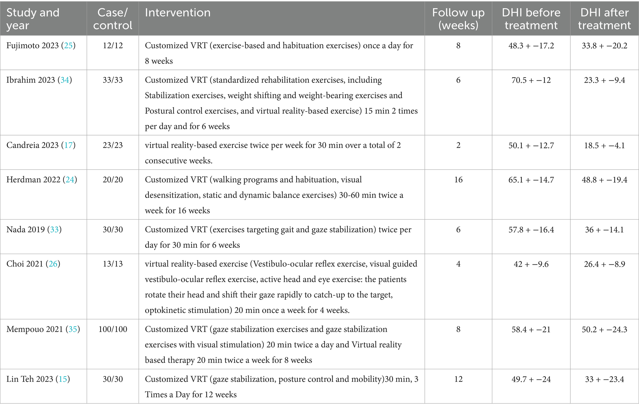 Vestibular rehabilitation therapy (VRT) is a program with graded exercises, consisting of eye, head, and body movements designed to stimulate the vestibular system (10). It employs customized exercises and maneuvers to promote compensation, adaptation, and habituation within the vestibular system, thereby reducing dizziness, imbalance, vertigo, and gaze instability (11). VRT includes various treatment approaches, including gaze stabilization exercises, balance training, habituation protocols, and the use of virtual reality systems. This treatment is essential for addressing the intricate vestibular dysfunctions that contribute to the persistent dizziness observed in PPPD. Its efficacy depends on regular and committed practice. VRT assists patients in overcoming maladaptive balancing habits, restoring vestibular function, and regaining everyday autonomy (12). It is a secure and efficacious non-invasive therapeutic alternative that can markedly enhance everyday functioning and quality of life (13, 14). Some studies have confirmed the effectiveness of VRT as a therapeutic intervention for individuals with PPPD (15). In a research conducted by Kundakci et al. (16), exercise-VRT offers benefits for adult patients with chronic dizziness regarding symptomatology, fall risk, balance, and emotional well-being. There has been limited research evaluating VRT outcomes in patients with PPPD (17–19), which have often exhibited a limited sample size, significant variability in caliber, and an absence of evidence-based support. Tramontano et al. (20) performed a scoping review which systematically organized existing evidence on VRT for PPPD through tabular narrative synthesis, its analytical scope was confined to descriptive statistics, precluding quantitative efficacy determinations. The present meta-analysis conducted quantitative analyses of all included studies, each of which employed the DHI as the primary outcome measure, which sought to aggregate and evaluate existing data to provide a robust evidence foundation for the efficacy of VRT and guide its therapeutic implementation.