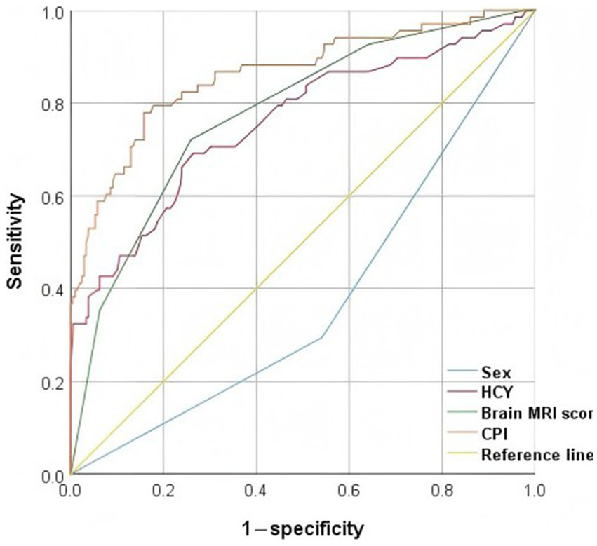 The ROC curves (Figure 2) for sex, brain MRI score, HCY, and combined predictive indicators (CPI) showed the AUC values of 0.377, 0.778, 0.758, and 0.862, respectively (Table 4). The result indicated that CPI had moderate clinical utility. In the ROC curve, the closer a point is to (0, 1), the better the model’s discriminatory ability. The predictive value of CPI for diagnosing DMPS-induced neurological deterioration in WD patients was superior to that of other individual indicators.
