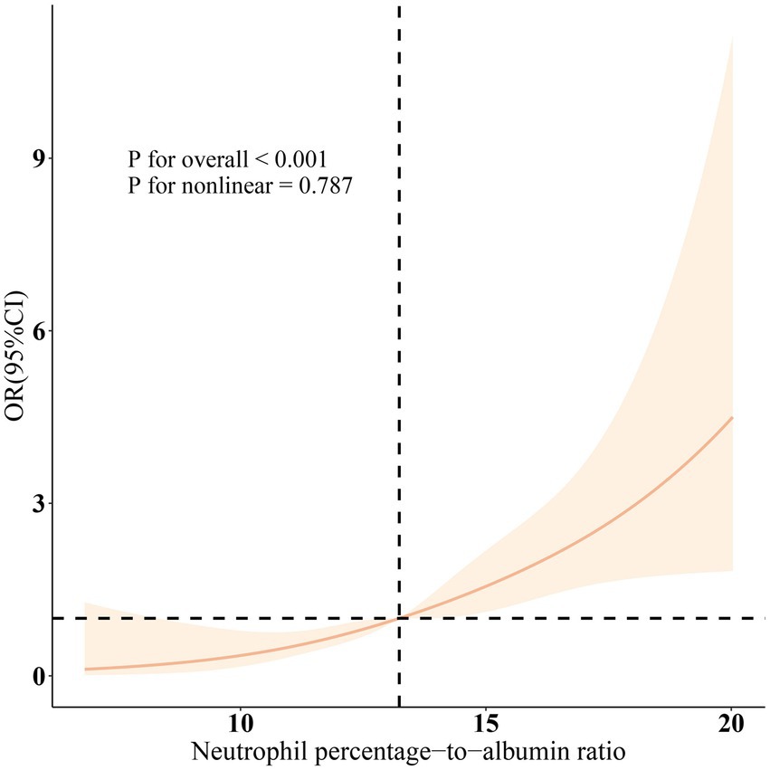 Figure 1. Dose–response relationships between NPAR and Muscular dystrophies. OR (solid lines) and 95% confidence levels (shaded areas) were adjusted for age, gender, education level, marital status, PIR, race, smoking, physical activity, hypertension, diabetes, and hyperlipidemia.