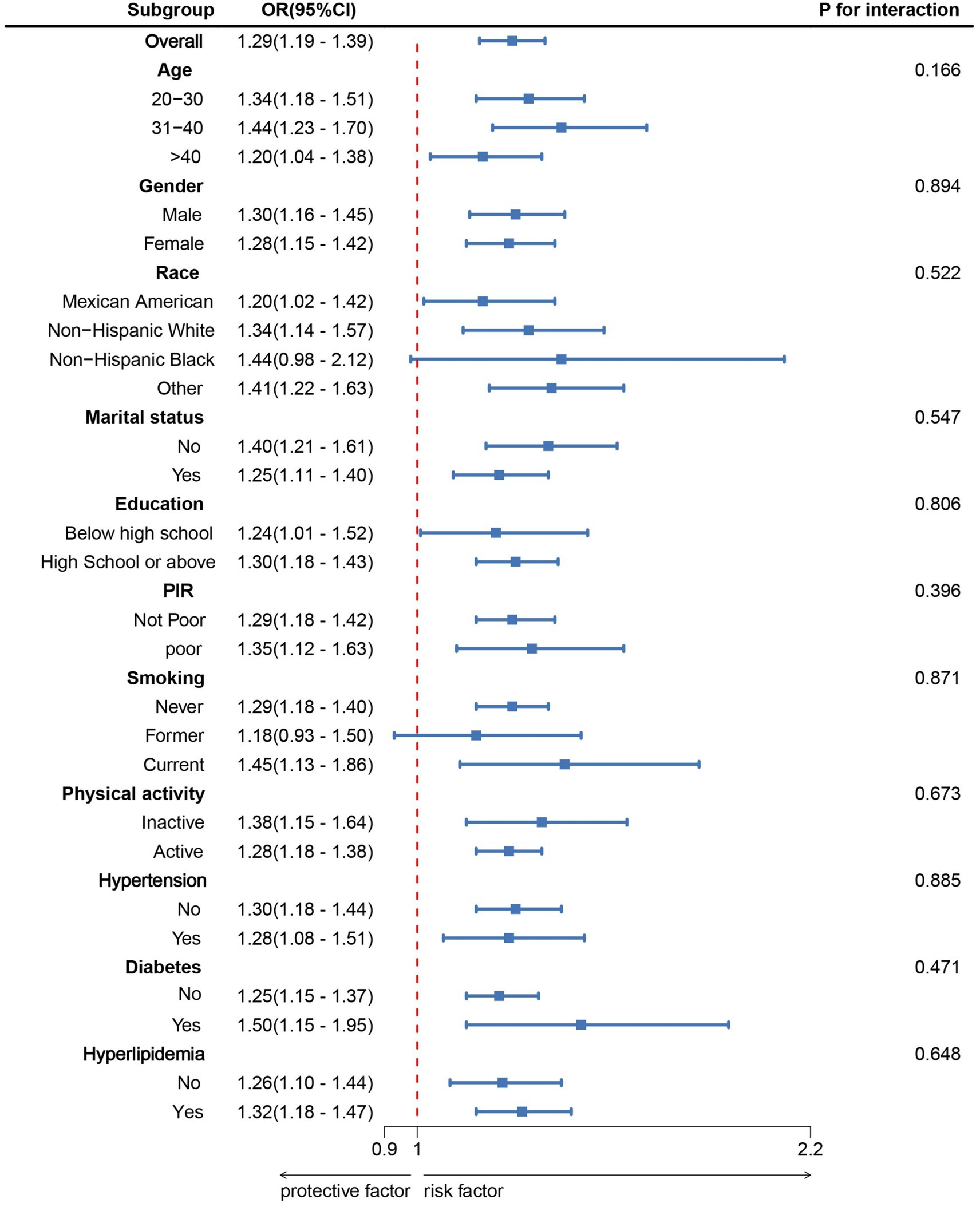 Figure 2. Subgroup analysis between NPAR and Muscular dystrophies. ORs were calculated for each 1 unit increase in NPAR. Analyses were adjusted for age, gender, education level, marital status, PIR, race, smoking, physical activity, hypertension, diabetes, and hyperlipidemia.
