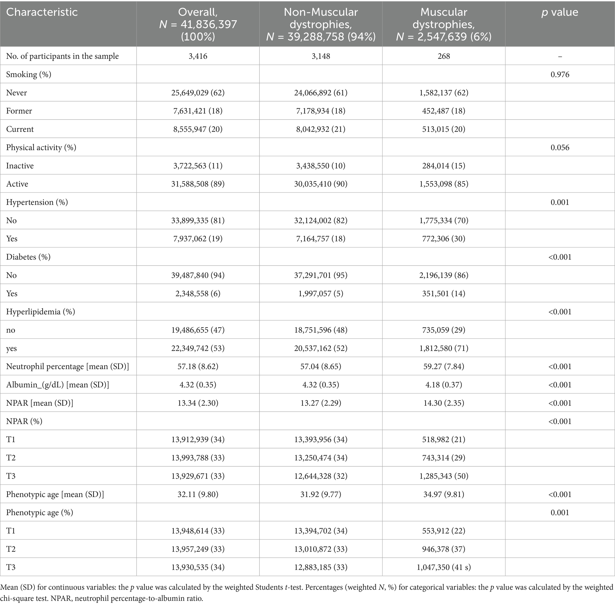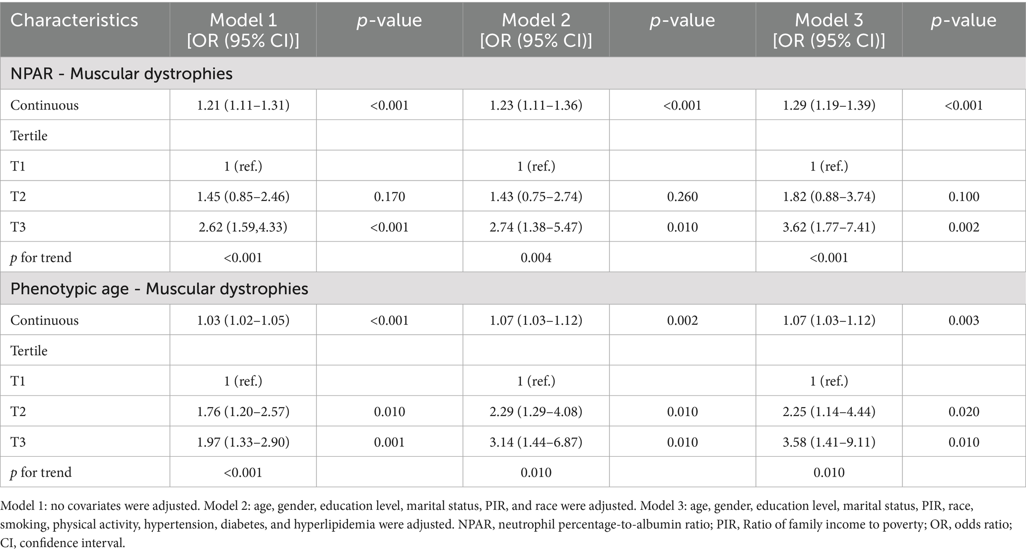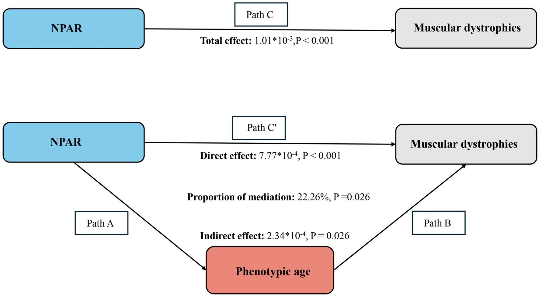 Results: A total of 3,416 participants were included in this study, among whom 268 cases of MD were reported (6%, weighted). After adjusting for all variables using multivariable logistic regression, each unit increase in NPAR and phenotypic age was associated with a 29% (OR = 1.29, 95% CI: 1.19–1.39) and 7% (OR = 1.07, 95% CI: 1.03–1.12) increase in the odds of muscular dystrophies, respectively. Consistent results were obtained when NPAR and phenotypic age were categorized into tertiles, with a p for trend < 0.001. Restricted cubic spline (RCS) analysis indicated a linear positive correlation between NPAR and MD prevalence. Mediation analysis showed that 22.26% of the relationship between NPAR and MD was mediated by phenotypic age (p = 0.026).
