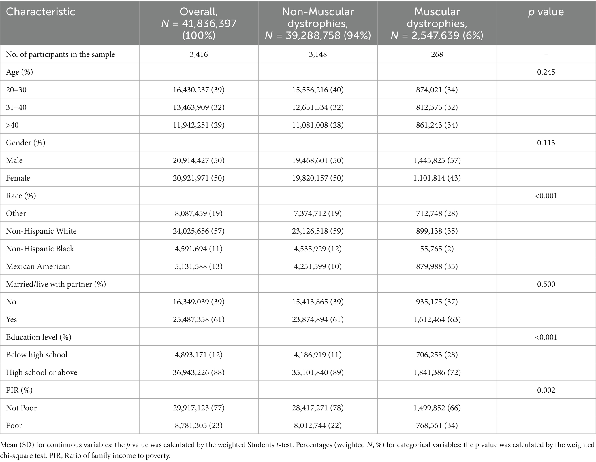 Table 1. Baseline characteristics of all participants were stratified by muscular dystrophies, describing the participants’ socio-demographic characteristics (weighted).