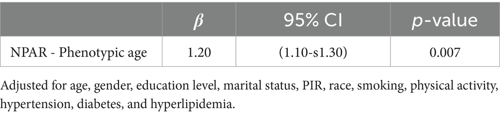 The mediation model is illustrated in Figure 3, where NPAR, MD, and Phenotypic Age serve as the independent variable, dependent variable, and mediator, respectively. Table 4 shows that, after adjusting for other covariates, there is a significant correlation between NPAR and Phenotypic Age (β = 1.20, 95% CI: 1.10–1.30).