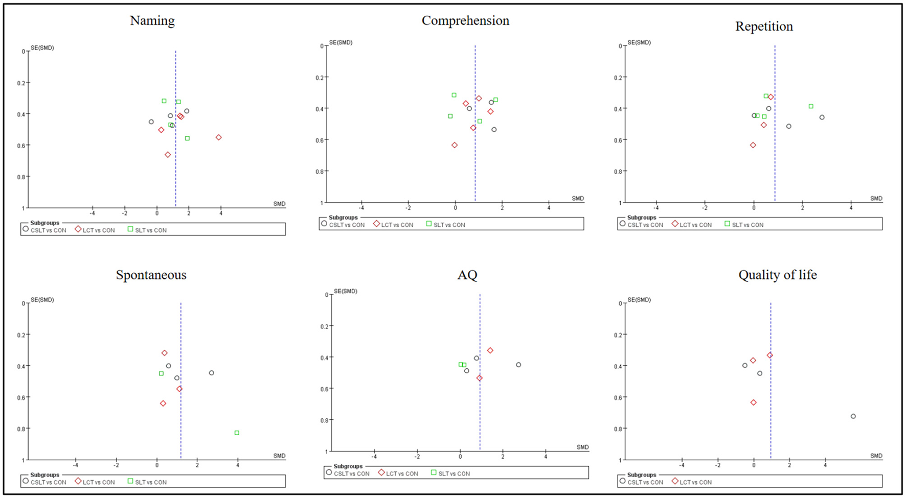 Funnel plot of naming, comprehension, repetition, spontaneous, AQ and quality of life in pairwise meta-analysis.