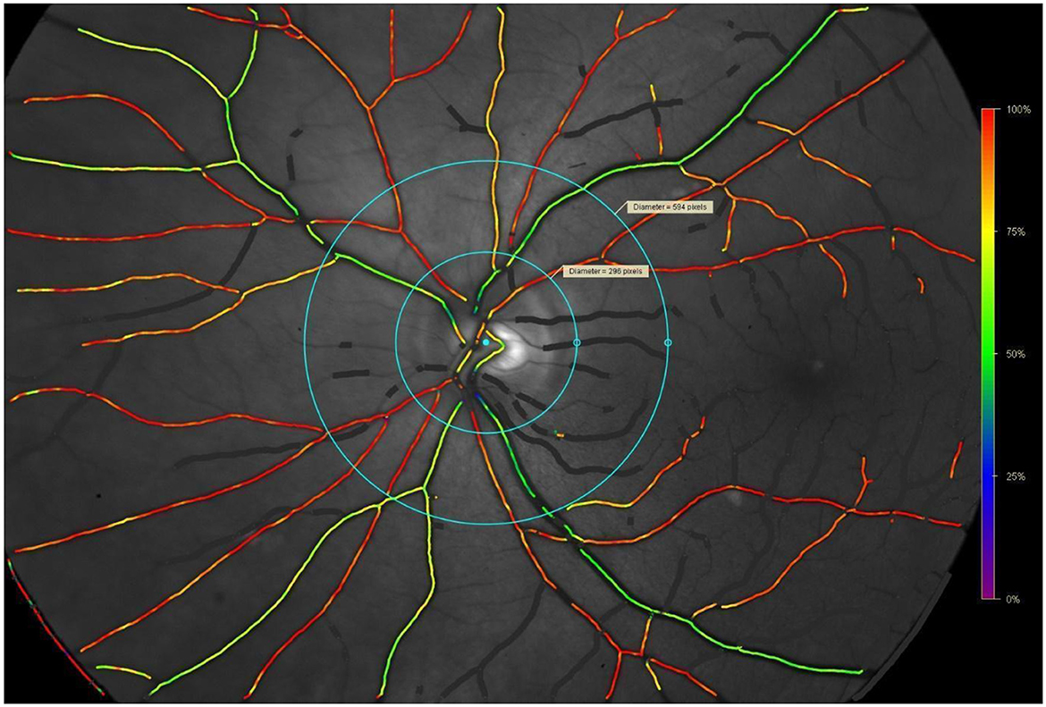 An automated analytic protocol was used to calculate the oxygen saturation. All eligible vessels in all measured quadrants were used but physiological crossing of blood vessels were excluded manually from the evaluation due to the risk of mixing of the absorbance spectrum of the two types of blood vessels.
