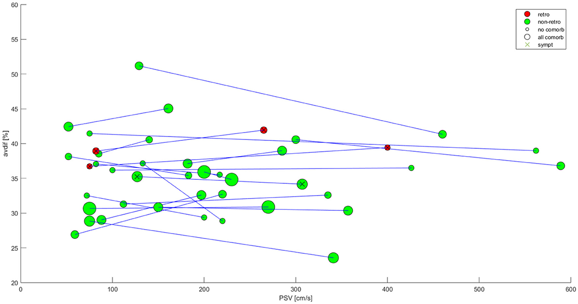 Scatter plot showing PSV (cm/s) on the x-axis and AV difference (percentage) on the y-axis. Data points are color-coded: red for retro, green for  orthograde. Circles indicate no comorbidity or all comorbidity, with size variation. Crosses mark symptomatic points. Lines connect related data points.
