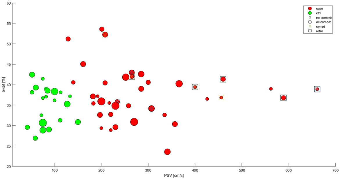 Figure 3. Data distribution dot graph. X axis-PSV (cm/s), Y axis-AV-difference (%). Controls-green, cases-red. Crossing-symptomatic (non-significant cerebrovascular event 6 months prior to the examination), dot size–number of comorbidities; square–retrograde ophtalmic blood flow No significant pattern observed in the baseline data distribution.
