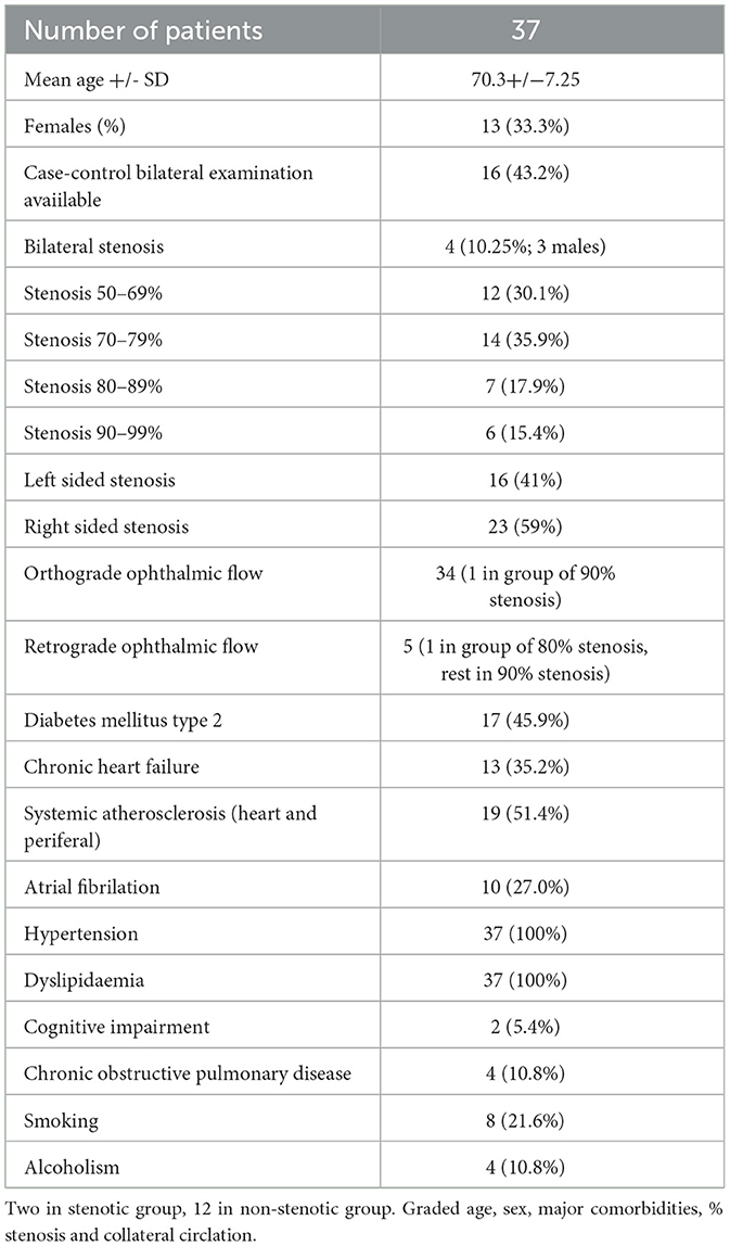 This case-control study was conducted between 2021 and 2023. Data from 37 patients with significant carotid stenosis over 50% were collected in the Neurology and Ophthalmology Departments of the hospital forming 74 eye artery pairs undergoing retinal oximetry evaluation. Mean age of the patients was 70.3 +/– 7.25 with female to male ratio 13:24. From his pool 4 patients presented bilateral stenosis forming the stenotic group of 41 eye artery pairs in the stenotic group and 33 eye artery pairs in non-stenotic group. Two eye artery pairs from the stenotic group and 12 eye artery pairs from the non-stenotic group were excluded from the study due to contraindications of retinal oximetry as listed below. The stenotic group then consisted of 39 eye artery pairs, 5 of them presented with retrograde ophthalmic blood flow. The 21 remaining non-stenotic eye artery pairs were used as a control group. In this way there were similar characteristics of the control group in terms of age, sex and cardiovascular comorbidity factors. Only 16 patients were eligible for bilateral testing comparing non-stenotic eye-artery to stenotic eye-artery as was done in Zhang et al. (10).