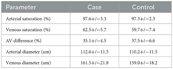 Table 1. Baseline sample characteristics, 39 artery-eye pairs in proband group, 21 artery-eye pairs in control group, 14 artery-eye pairs excluded due to contraindications for automated retinal oximetry.