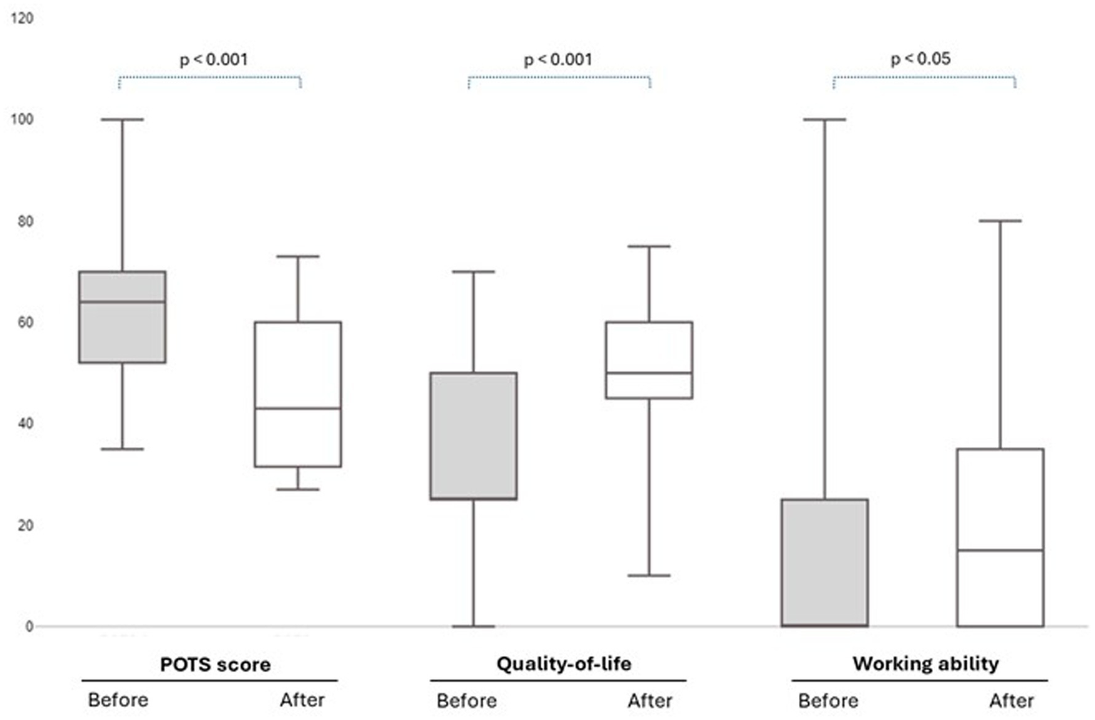 Among 19 responders at follow-up, the mean subjective benefit of the treatment was 5.5 ± 2.4 on a 0–10 scale, 8 (42%) wanted to continue the infusions, 10 (53%) were unsure, whereas 1 (5%) did not want to continue. As depicted in Figure 2, the median POTS score decreased from a pre-treatment level of 64 (IQR 16) to a post-treatment level of 43 (IQR 29), on a 0–120 scale (p < 0.001). Quality-of-life increased from a pre-treatment level of 25 (IQR 25) to a post-treatment level of 50 (IQR 15), on a 0–100 scale (p < 0.001), and median working ability increased from a pre-treatment level of 0 (IQR 25) to a post-treatment level of 15 (IQR 35), on a 0–100 scale (p < 0.05). Among those who reported the highest benefit of the treatment (≥6 on a scale 0–10, n = 8), QoL increased with 29 units on a 0–100 scale, ability to work increased with 14 units on a 0–100 scale, and the POTS score decreased with 26 points on a 0–120 scale. These individuals all had general joint hypermobility and had numerically lower hydration levels at baseline (44 ± 5%), as compared to patients who reported no benefit of the treatment (52 ± 6%), p = 0.22 with a small sample size of 7.