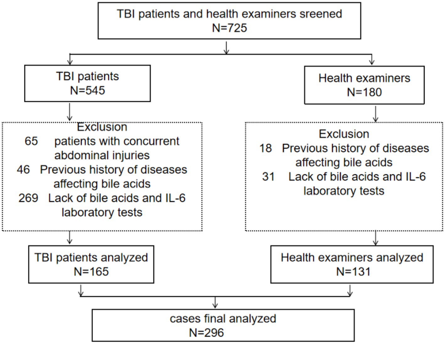 Figure 1 shows the flowchart of the case collection process. In the initial search process, we collected 545 patients with traumatic brain injury and 180 healthy examinees from the same period. We reviewed the titles and abstracts of 306 studies, and excluded 380 patients with traumatic brain injury for the following reasons: accompanied by abdominal injury (n = 65); History of liver and gastrointestinal diseases in the past (n = 46); Individuals lacking indicators such as bile acids and IL-6 (n = 269). 49 cases were excluded from the health examination due to the following reasons: previous medical history of liver, gastrointestinal tract, etc. (n = 18); Individuals lacking indicators such as bile acids and IL-6 (n = 31). Therefore, 296 eligible studies were ultimately included, including 165 patients with traumatic brain injury and 131 healthy individuals undergoing physical examinations. Figure 1 shows the complete case collection strategy and flowchart.