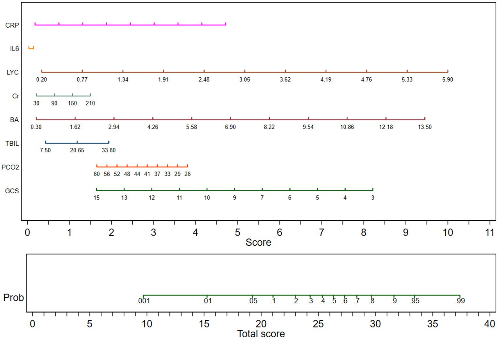 Figure 2. Column chart for multiple factor regression analysis in TBI patients. GCS, Glasgow Coma Scale; PCO2, partial pressure of carbon dioxide; TBIL, total bilirubin; BA, bile acid; Cr, Creatinine; LYC, lymphocyte count; IL-6, Interleukin-6; CRP, C-reactive protein.