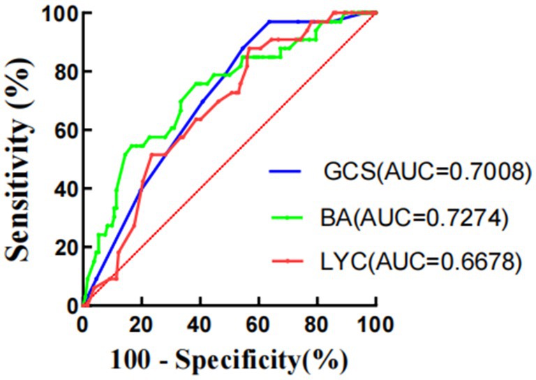 For TBI patients, BA, LYC, and GCS scores are equally sensitive and specific for predicting 30 day mortality. AUC, Area under the curve, GCS(AUC = 0.7008,p = 0.0004), BA(AUC = 0.7274,p < 0.0001), LYC(AUC = 0.6678,p = 0.0029). The ROC curves of GCS, BA, and LYC in TBI patients is shown in Figure 3.
